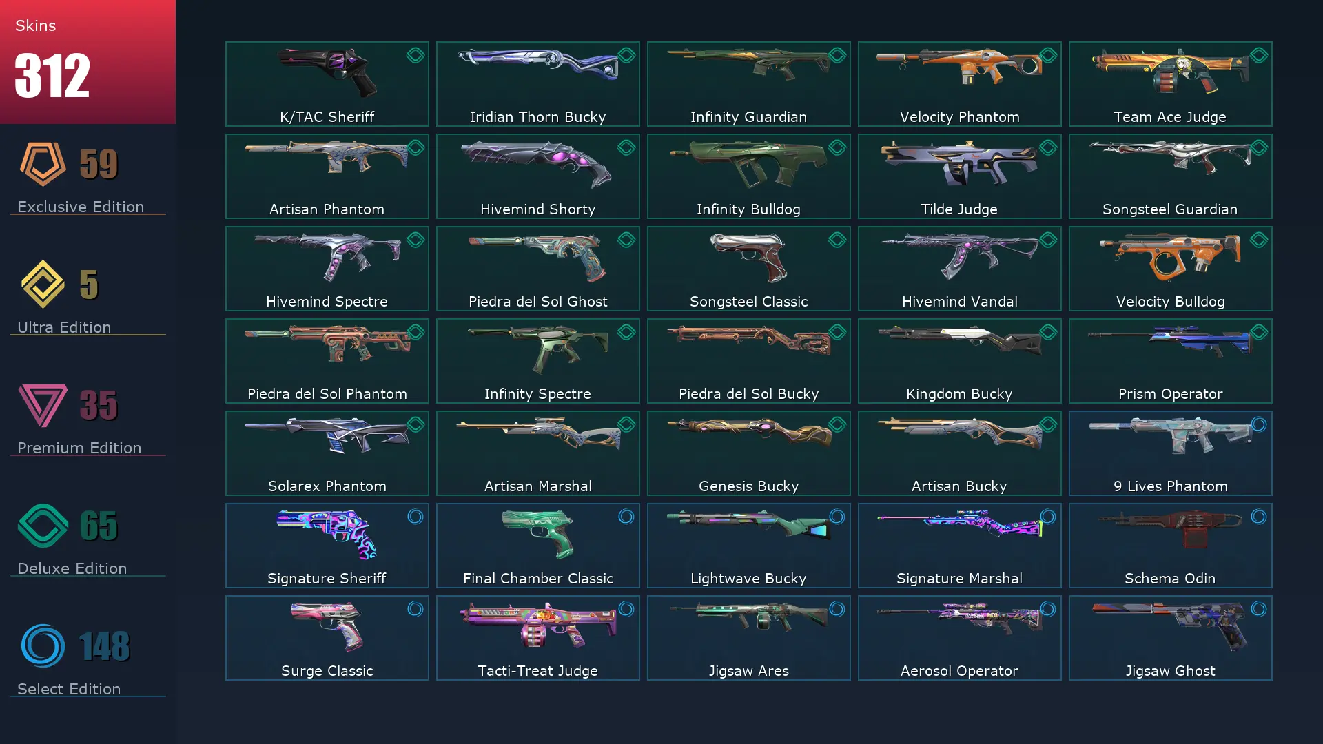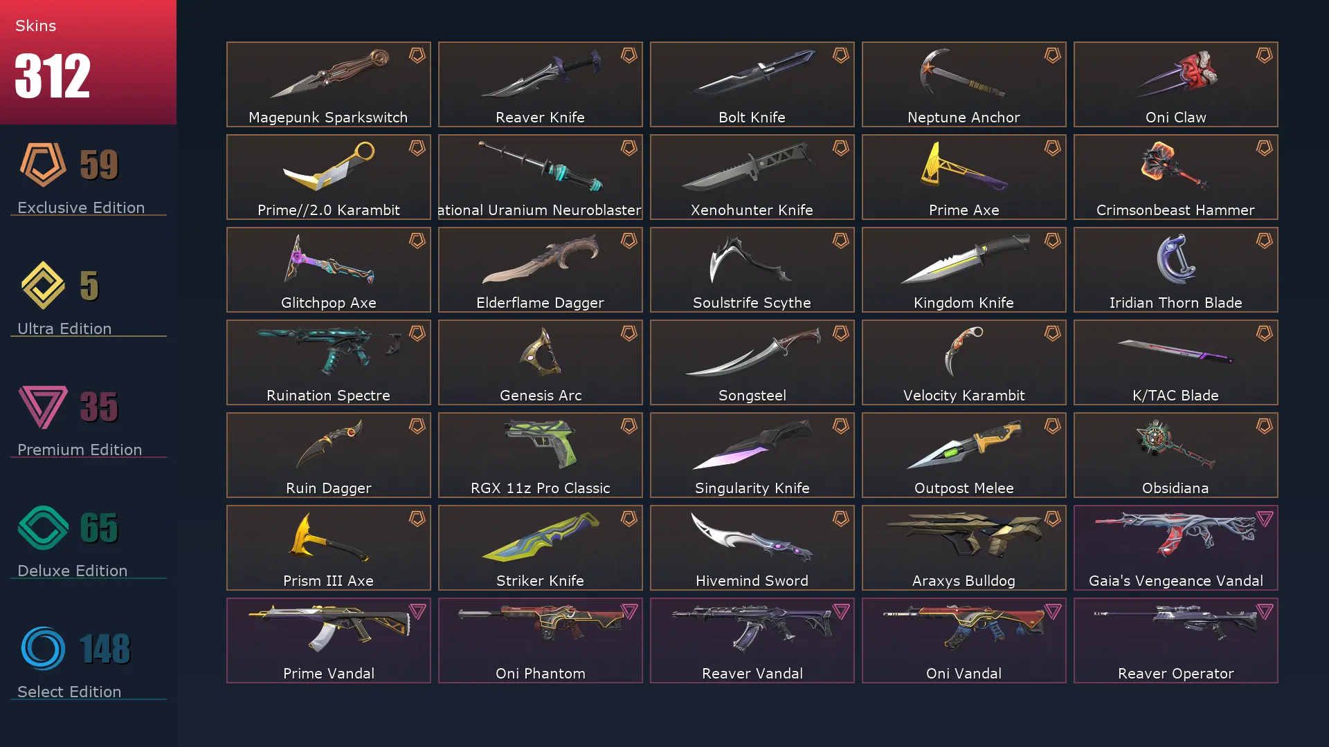 EU 🪮 312 Skins 🗂 22 Agents 🧦 340 Level 🚵 Champions 2022 Phantom 🖕 VCT LOCK//IN Misericórdia 🧗 Champions 2022 Butterfly Knife 🦆 Gaia's Vengeance Ghost 🔦 Oni Claw 🕋 Soulstrife Scythe 🤩 Reaver Phantom 🎆 Glitchpop Phantom