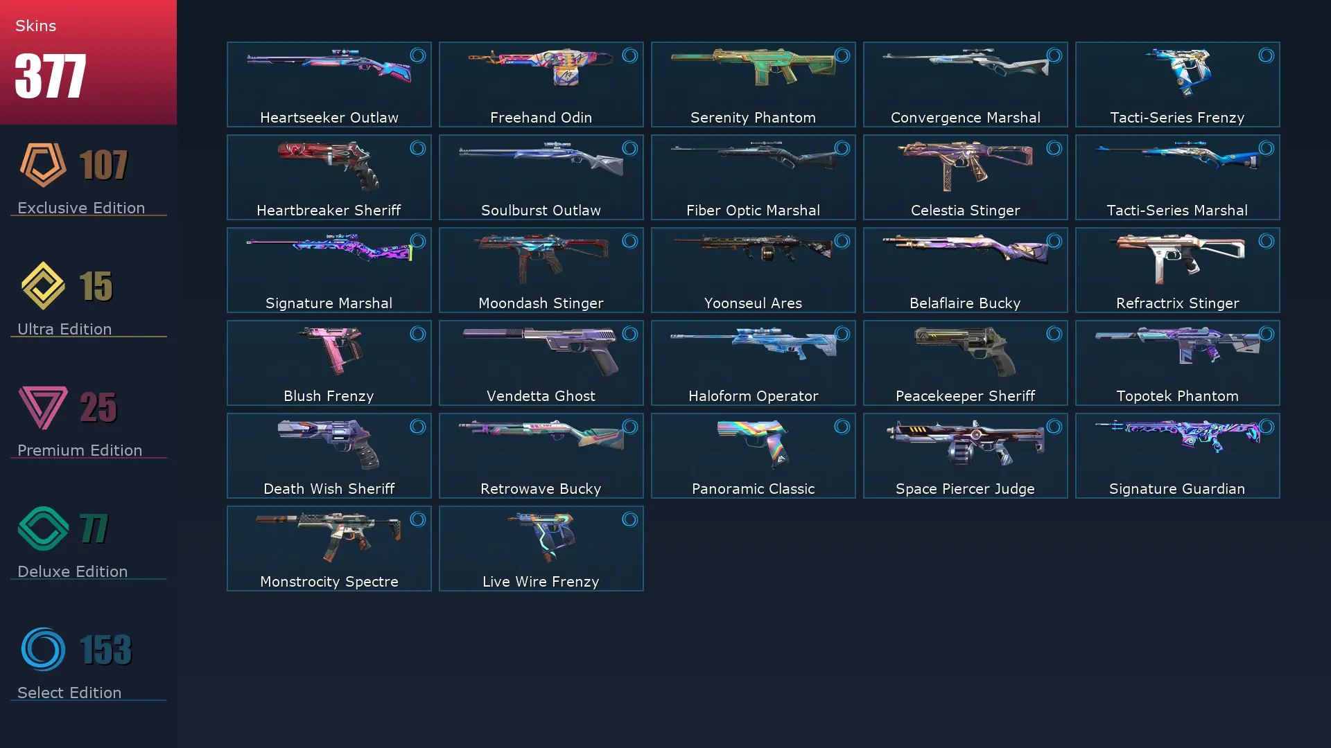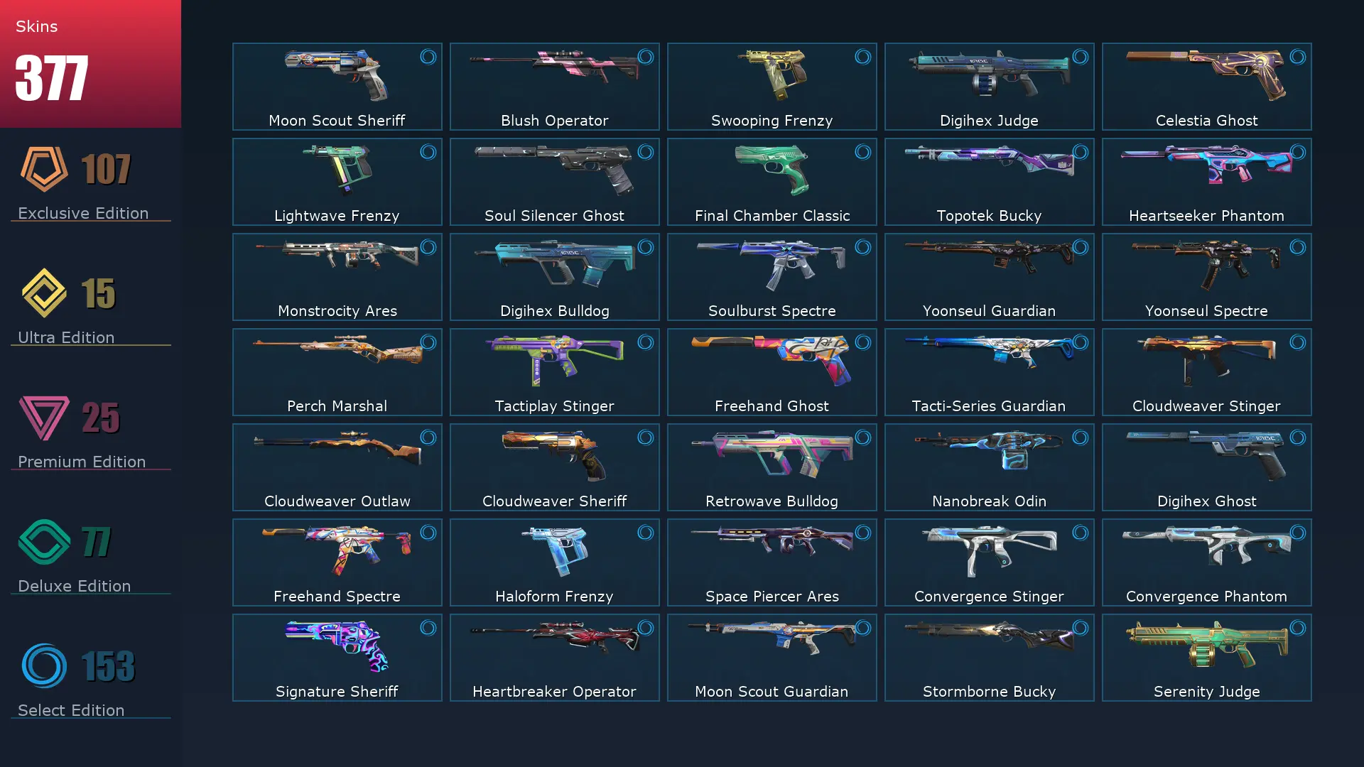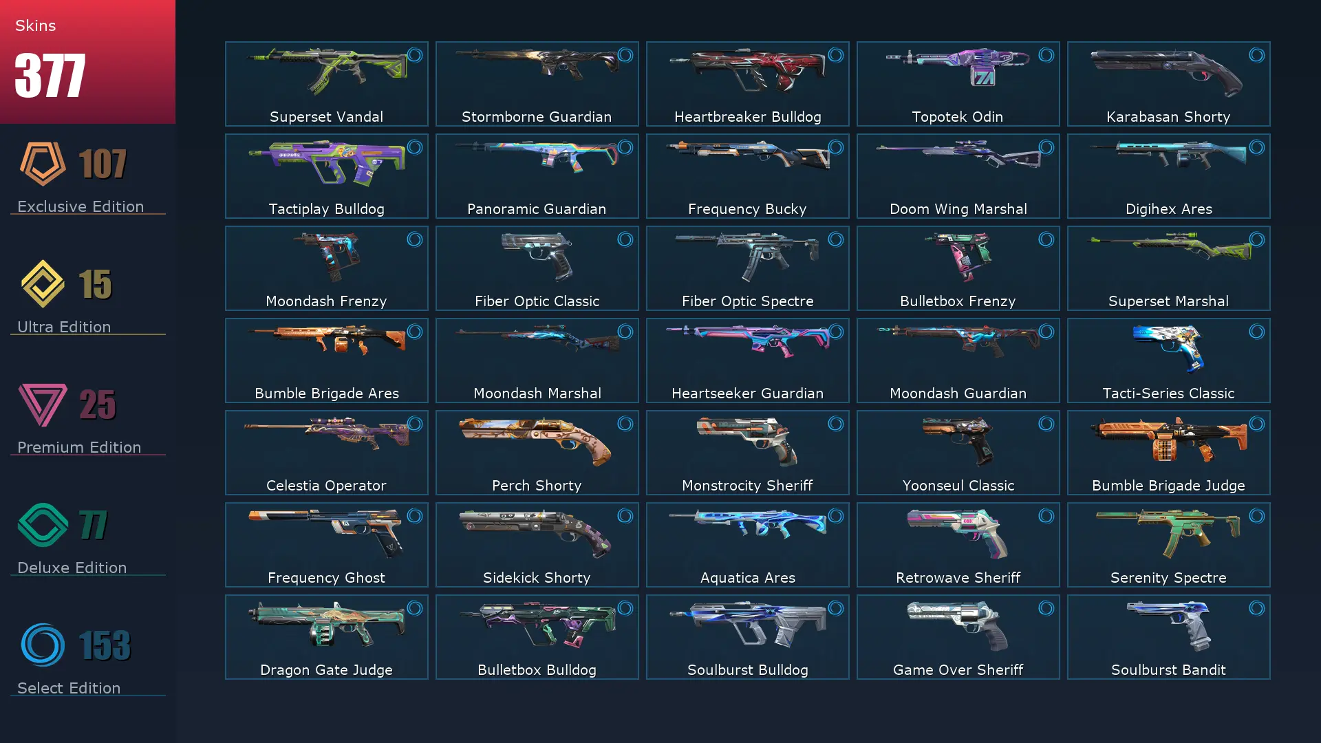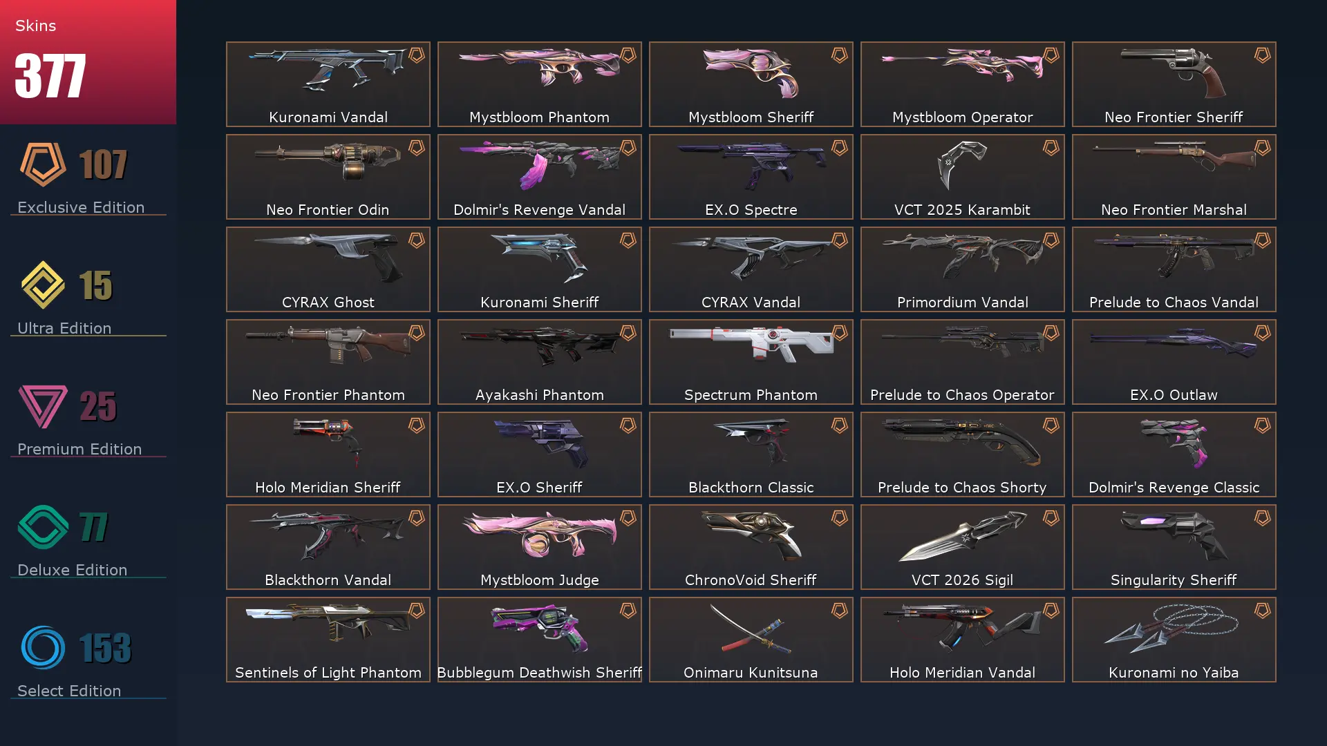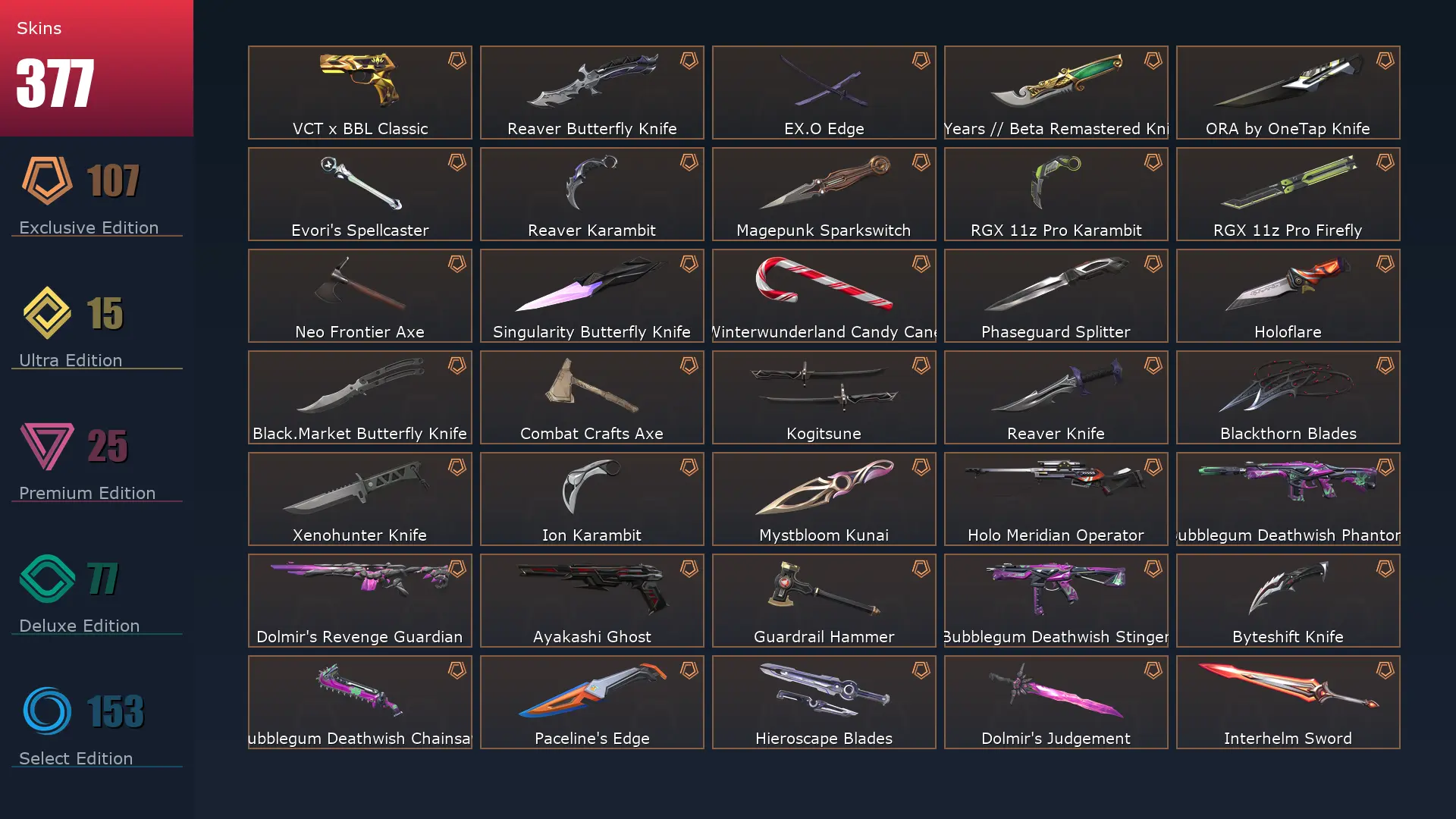 EU ๐ค 377 Skins ๐ Platinum 2 ๐ฅ 29 Agents ๐ซ 446 Level ๐ฆผ Arcane Vandal ๐ Champions 2021 Vandal ๐งธ Champions 2023 Vandal ๐ฐ Champions 2025 Vandal ๐ Champions 2024 Phantom ๐ Champions 2025 Butterfly Knife ๐ง Champions 2021 Karambit