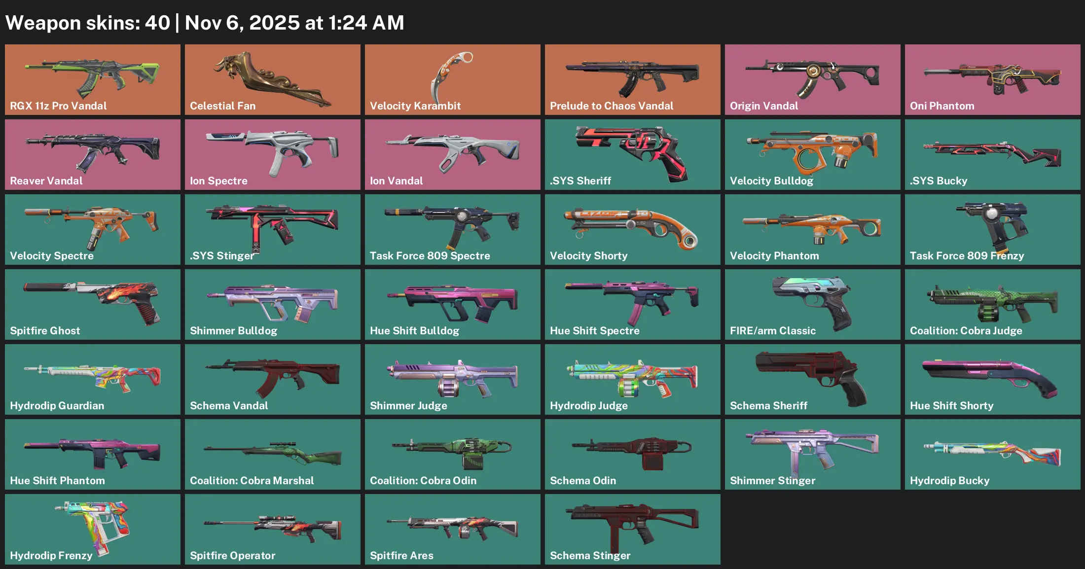 EU | 40 Skins | exp IRON 3 | RGX 11z Pro Vandal | Reaver Vandal | Ion Vandal | Prelude to Chaos Vandal | Origin Vandal | Oni Phantom | S4G
