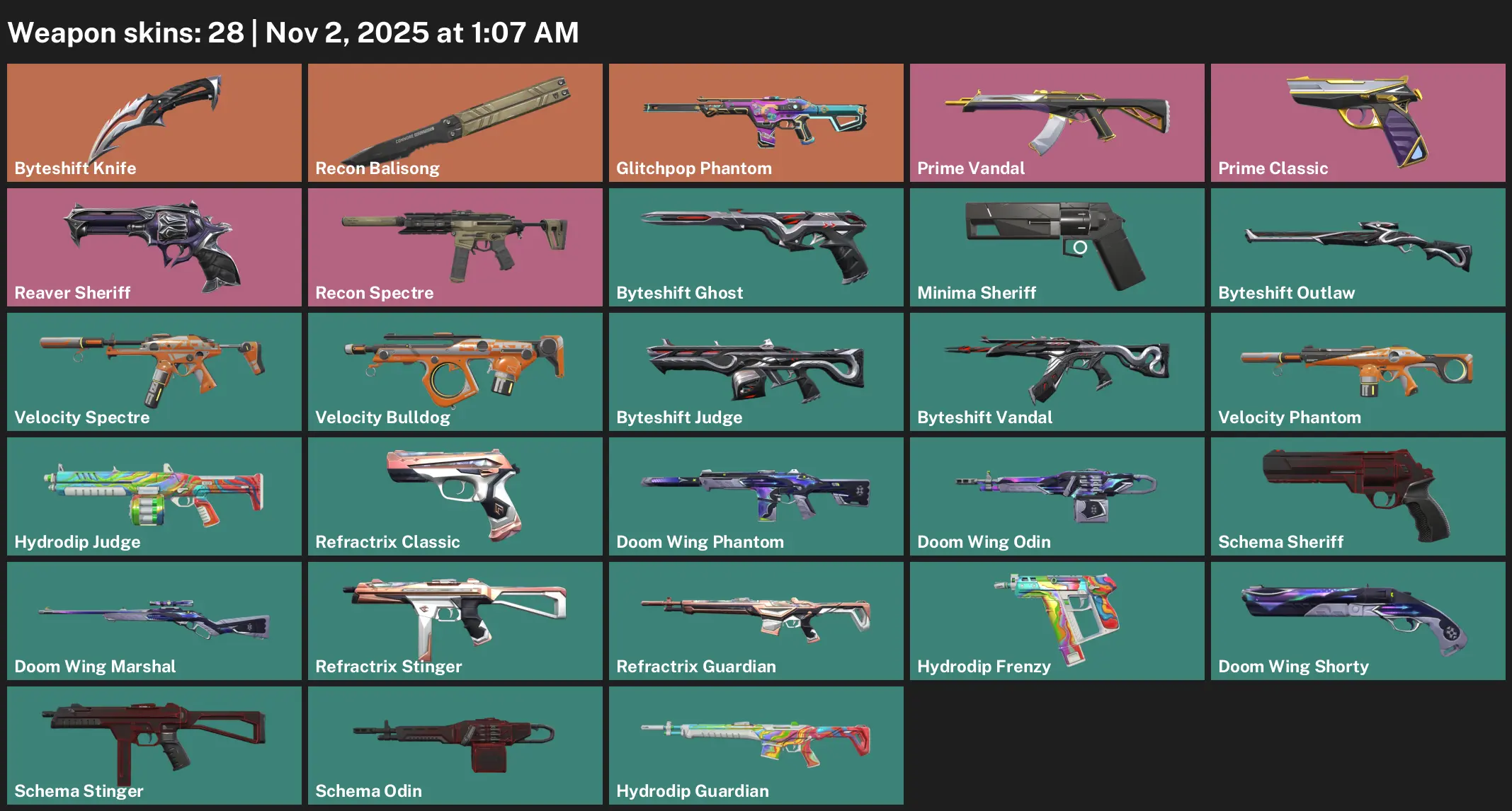 ☀️ EU 🦩 Unranked 🫘 28 Skins 📤 171 VP 🥬 15 Agents 🏢 Value: 14100 VP 🛖 Byteshift Knife 🐃 Recon Balisong 🧬 Glitchpop Phantom 🍚 Prime Vandal 😿 Prime Classic 🍥 Reaver Sheriff