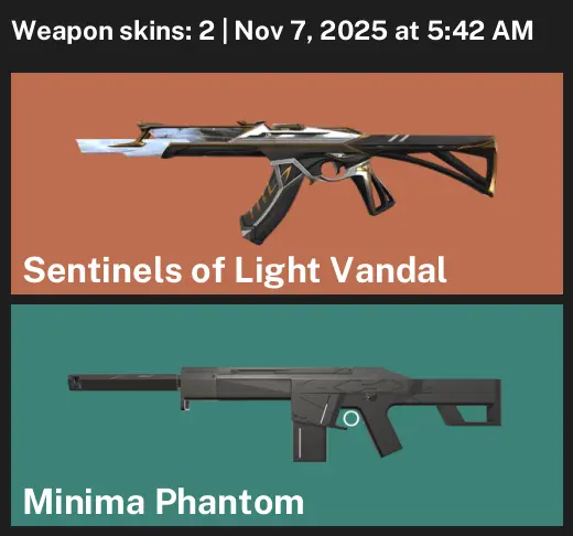 🥌 NA 🍴 Unranked 🎟 2 Skins 🪸 0 VP 🍼 4 Agents 📮 Value: 3450 VP 📪 Sentinels of Light Vandal 🚪 Minima Phantom