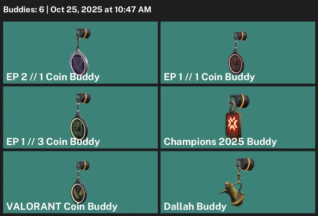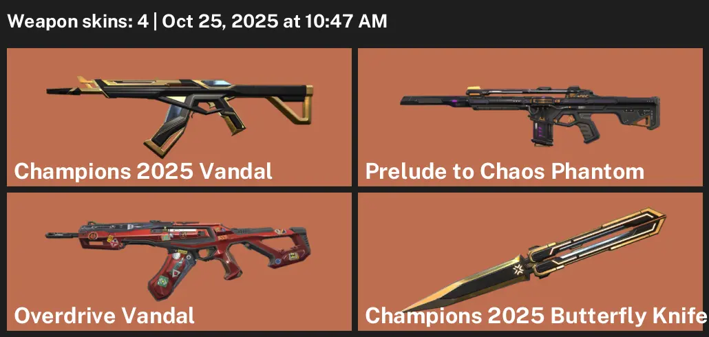 โ๏ธ NA ๐ซ Unranked ๐จ 4 Skins ๐ 10 VP ๐ค 2 Agents ๐ฎ Value: 12375 VP ๐ Champions 2025 Vandal ๐บ Prelude to Chaos Phantom ๐ท Overdrive Vandal ๐ผ Champions 2025 Butterfly Knife
