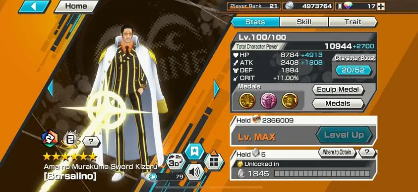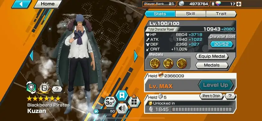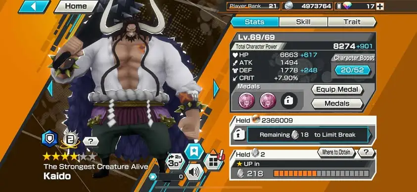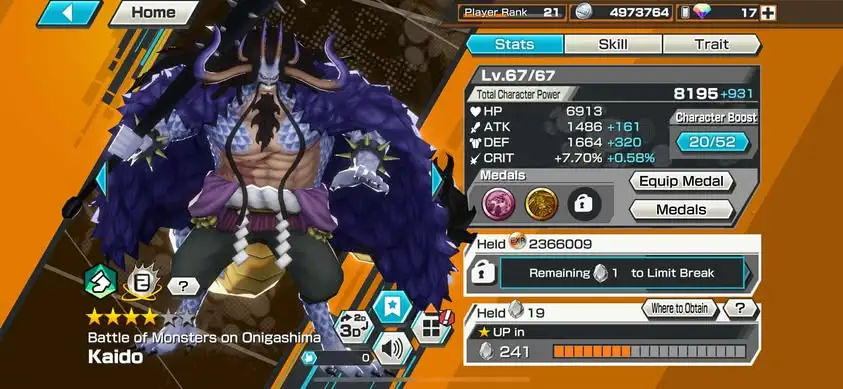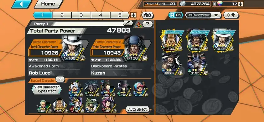 [3371][IOS+ANDROID] 5 EX / CAN UP MAX 4 / Lucci + Kizaru + Kuzan + 2 Kaido / 1584 gold stones, Support 130%, Good Medal
