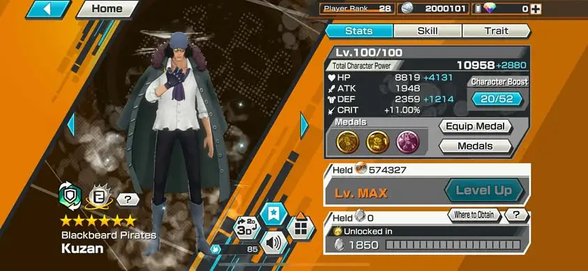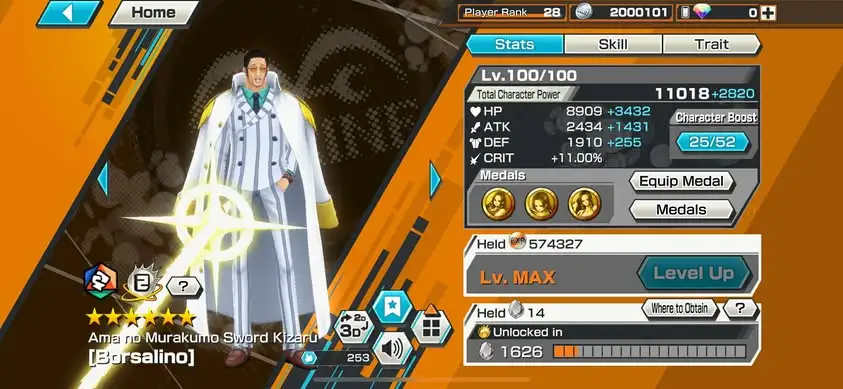 [3395][IOS+ANDROID] 7 EX / 6 MAX / Kizaru (Skin) + Lucci + Sabo + Kuzan + Roger + Luffy G5 + Blackbeard, Support 146%, Good Medal, BFs Jabrs + Blueno
