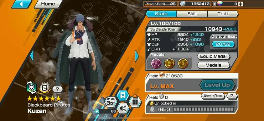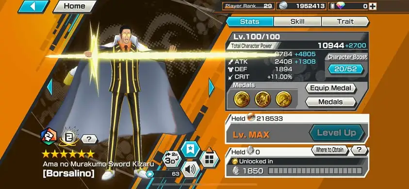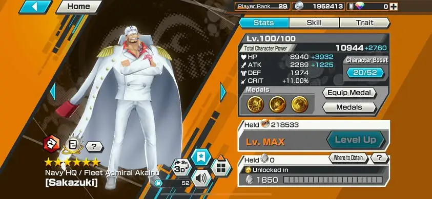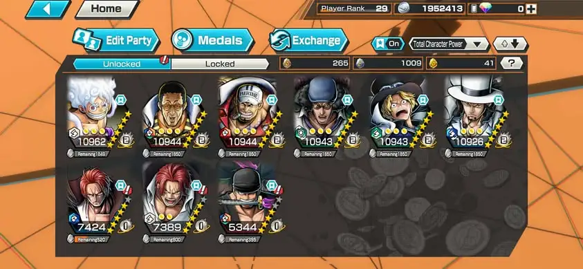 [3396][IOS+ANDROID] 9 EX META / Kizaru + Luffy Light + Kuzan + Sabo + Shanks Light + Akainu + Lucci + Zoro + Shanks Blue , Support 160% , Best Medal
