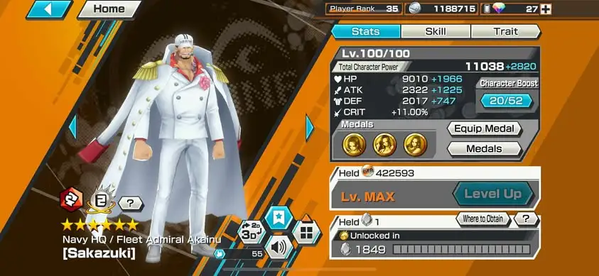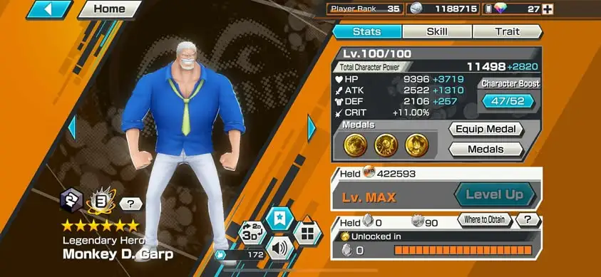 [3415][IOS+ANDROID] 6 EX MAX / HB 41 / Garp Can Up B52/52 + Kuzan + Sabo + Akainu + Roget + Zoro , Support 159% , Good Medal