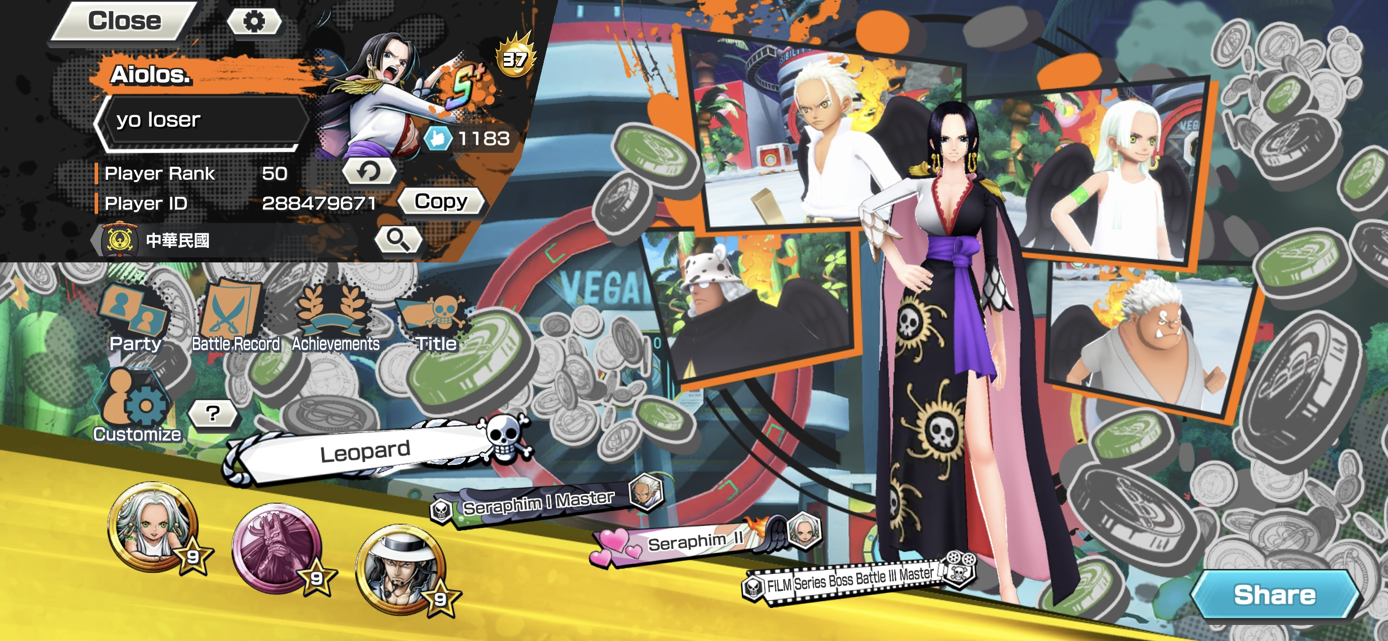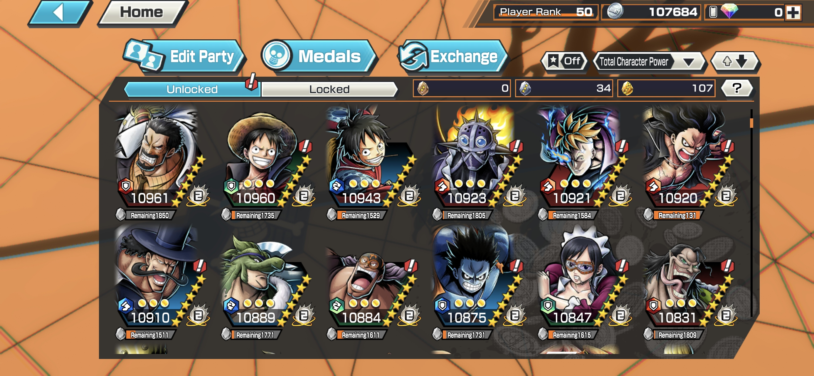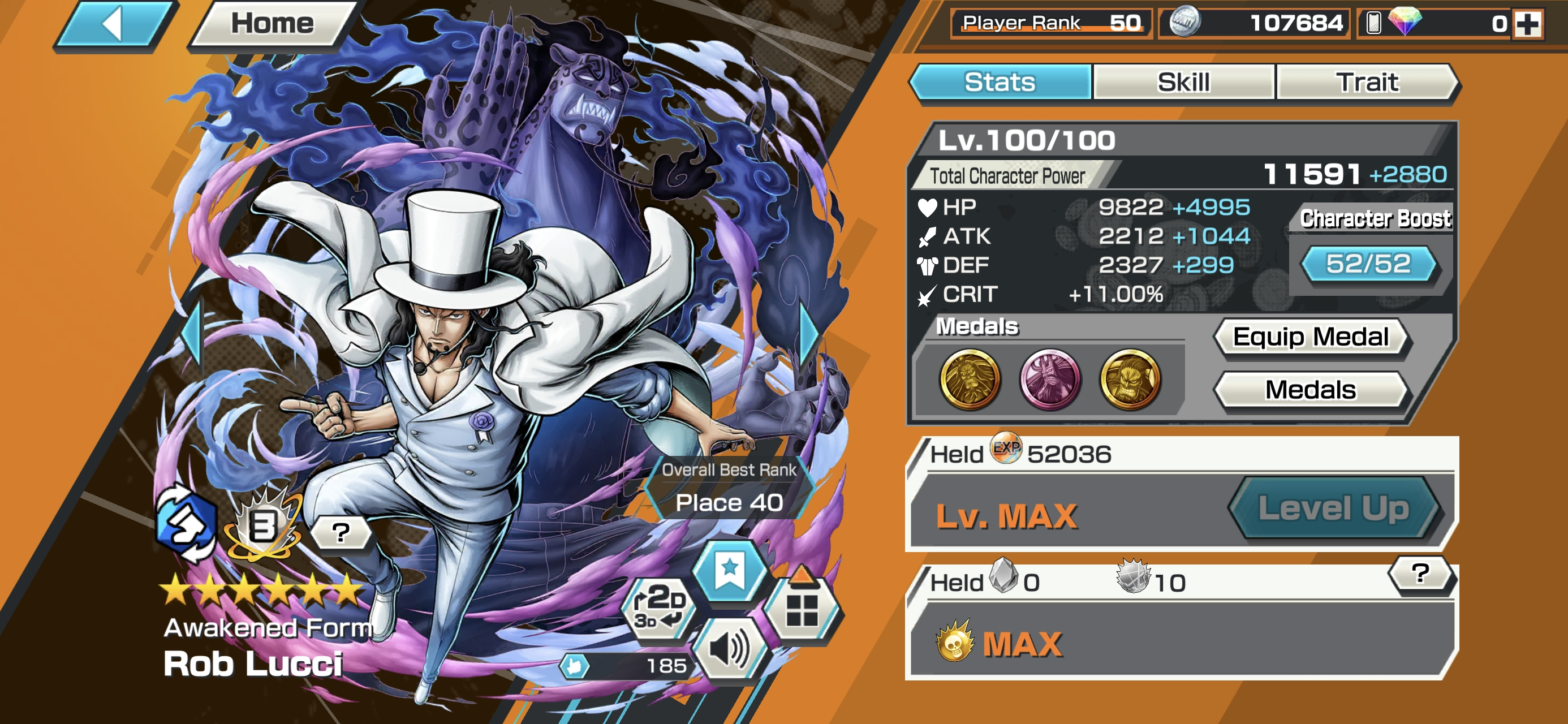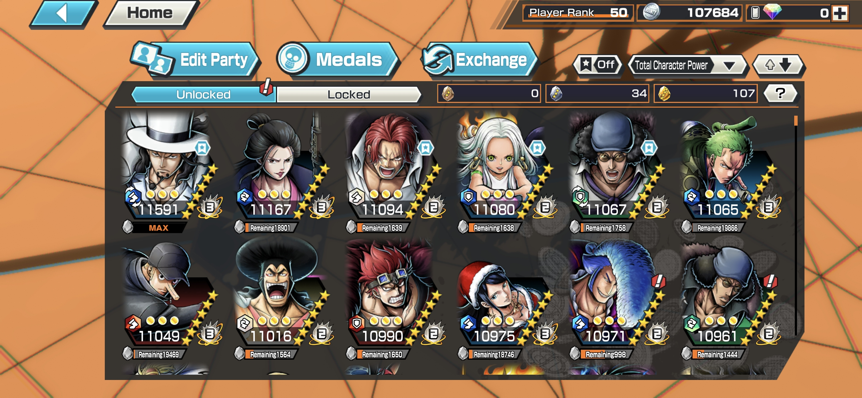 Rob Lucci Max Full Boost 3 ⸱ HB 37 ⸱ 6 Ex Meta 4 Max ⸱ Shanks Max Power 11K ⸱ Ssnake Max Power 11K ⸱ Kuzan Max Power 11K ⸱ Sabo ⸱ Roger ⸱ Support 166 ⸱ Good Medal ⸱ Gems ⸱ Many Medal Material ⸱ B472