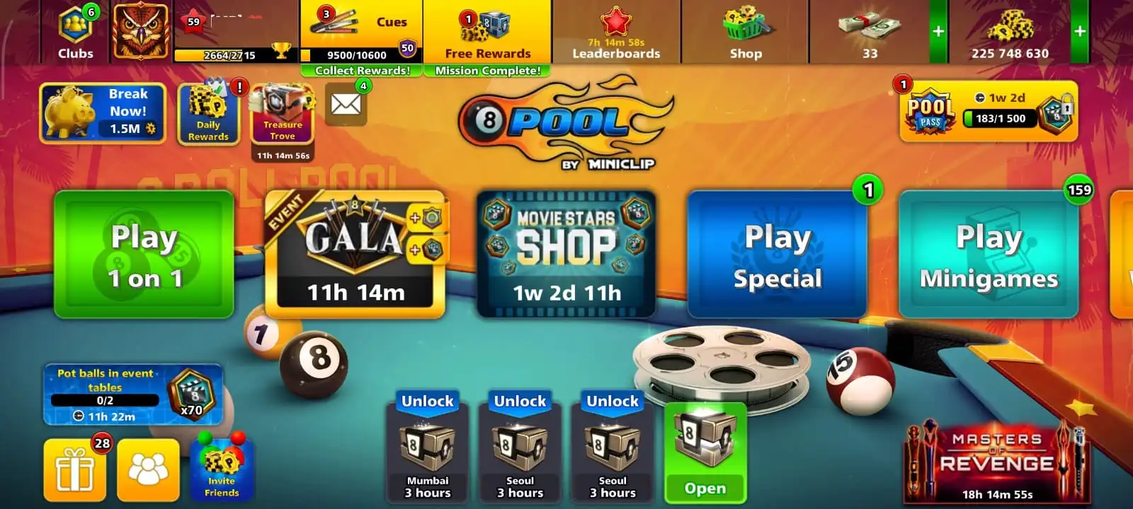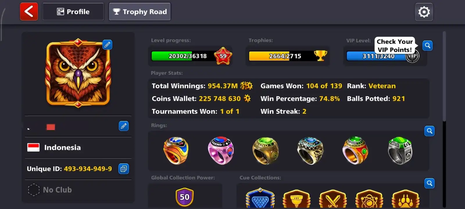cheapest🔥level 59🔥cues 7 legendary🔥coins 225M🔥rare rings🔥full access account🔥