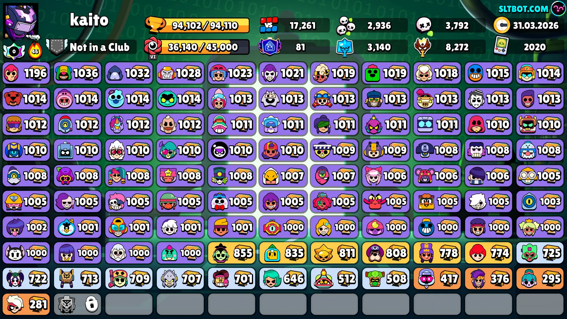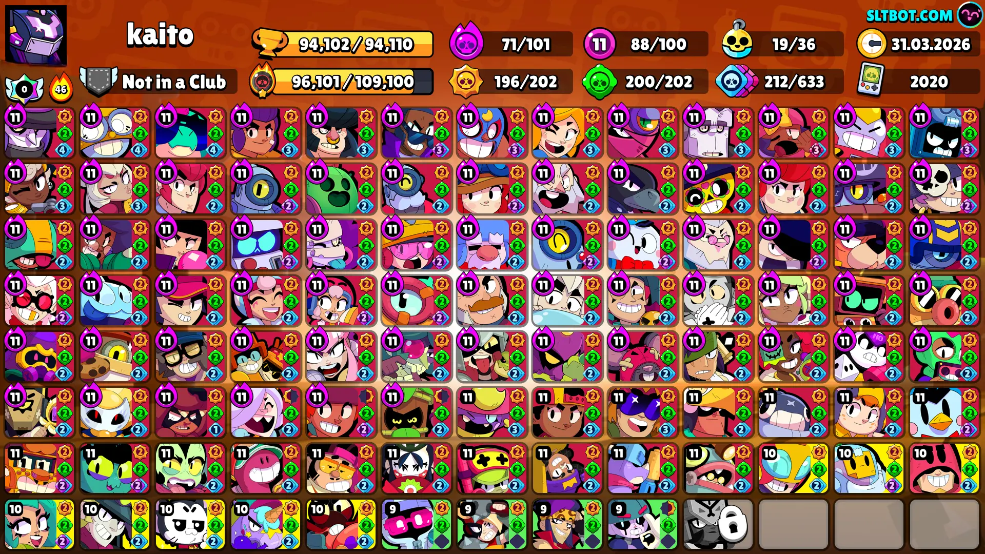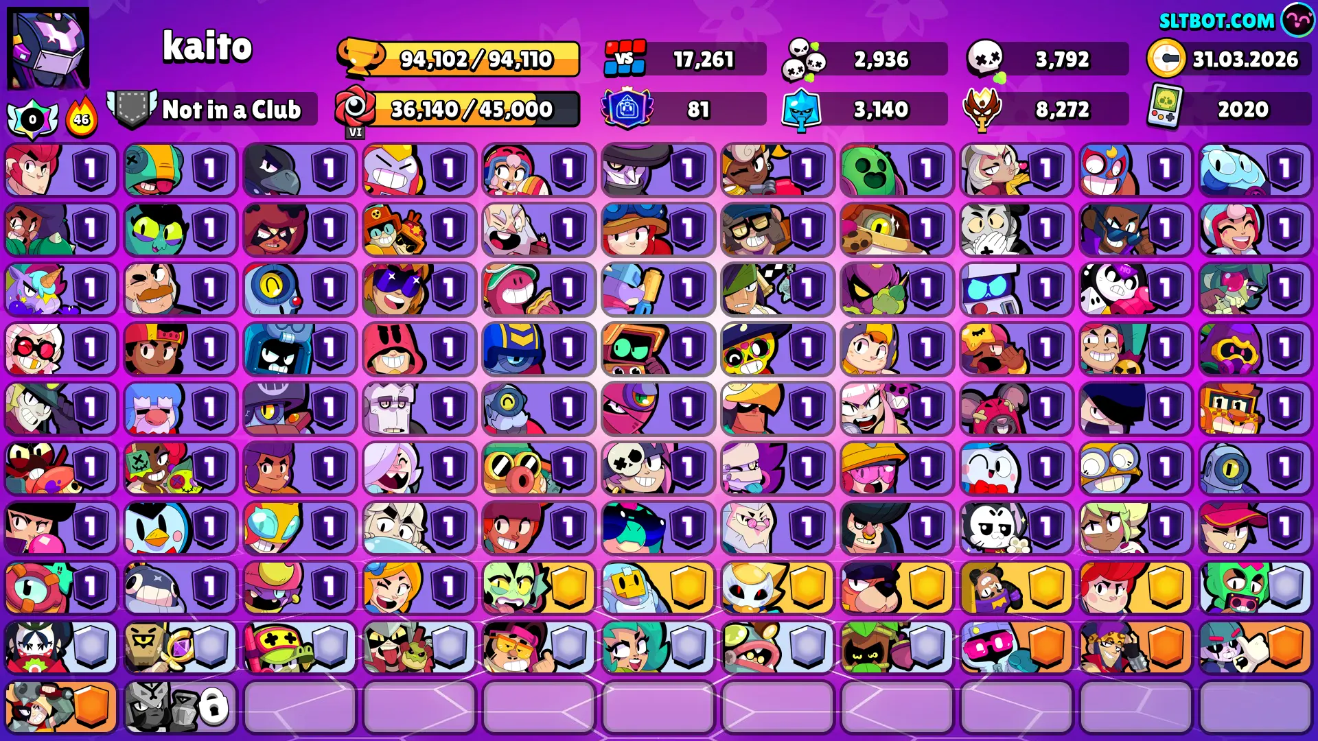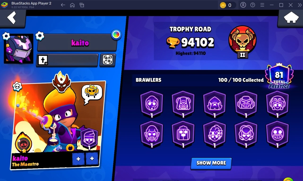 381 SKINS 💯 MASTERS 2025 💜 94.102 TROPHIES 🏆 100 BRAWLERS 🐼 71 HYPERCHARGED 🩸 81 PRESTIGE 💜 88 MAX BRAWLERS 💛 19 BUFFIES 🔑 NIGHT MECHA CROW 🧡 MECHA FINX 🧡 MECHA MORTIS 🧡 FEROCIOUS FANG 💯 80K 90K