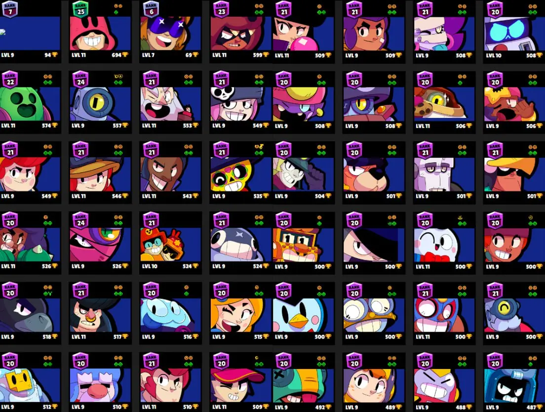 ๐ 79 Brawlers ๐ 33.345 Trophies ๐ 90 Skins ๐ 10 Legends ๐ 25 Mythics ๐ 25 Epics ๐ 7745 Gold ๐ 147 Gems ๐ 6873 Blings ๐