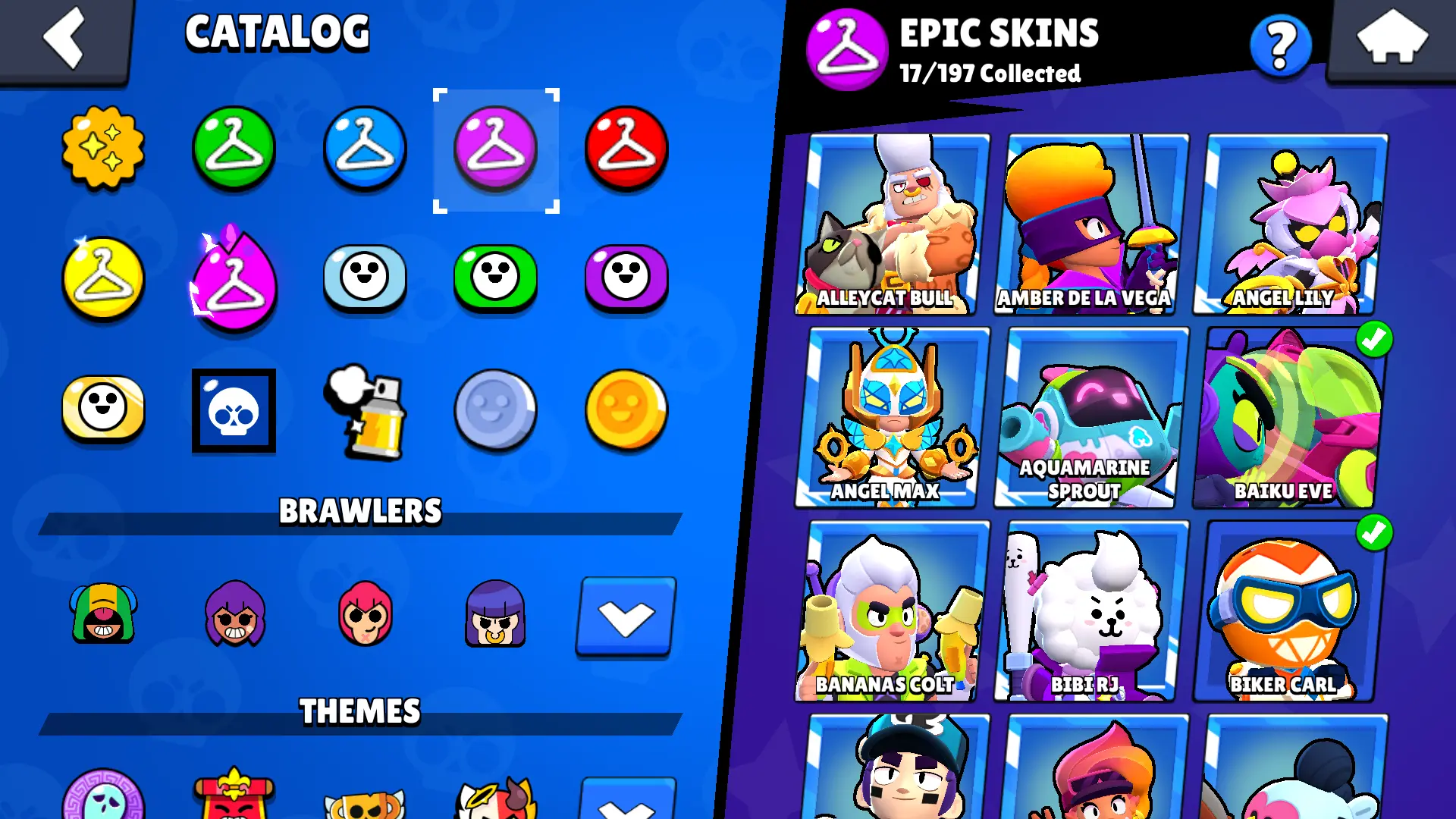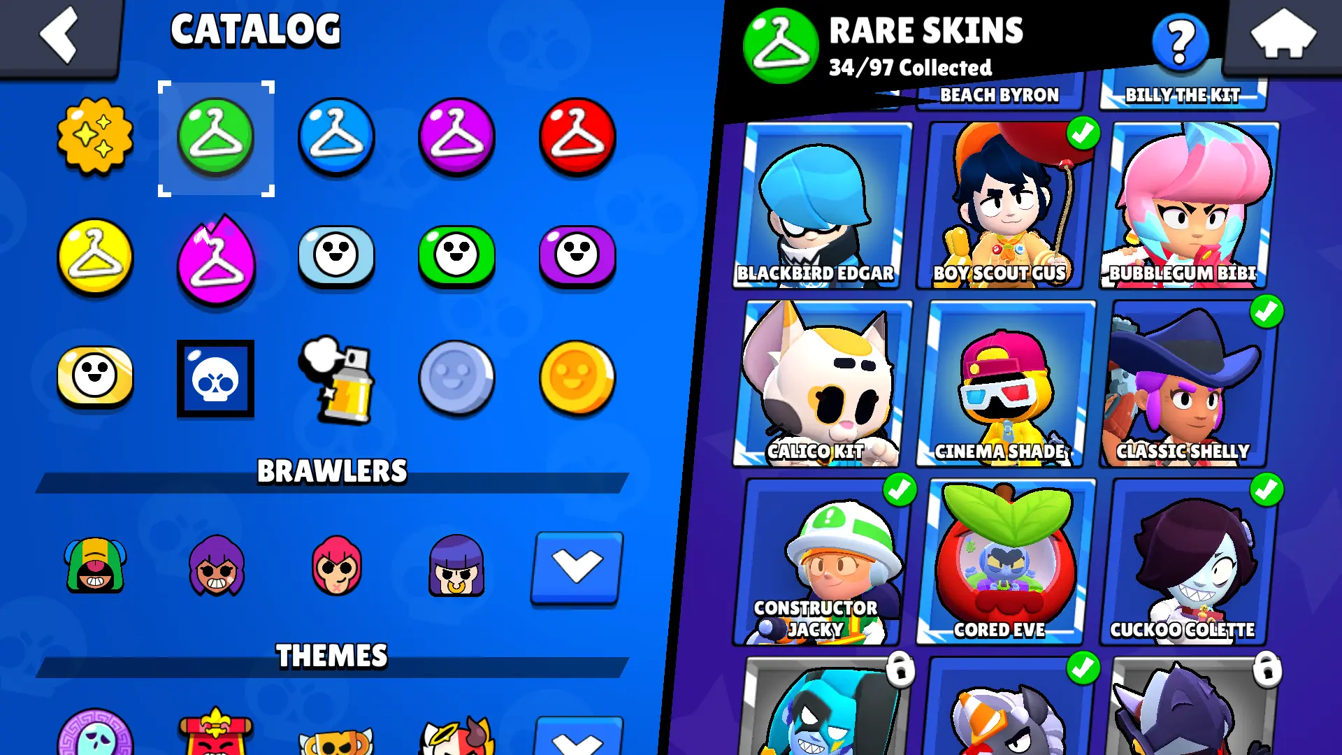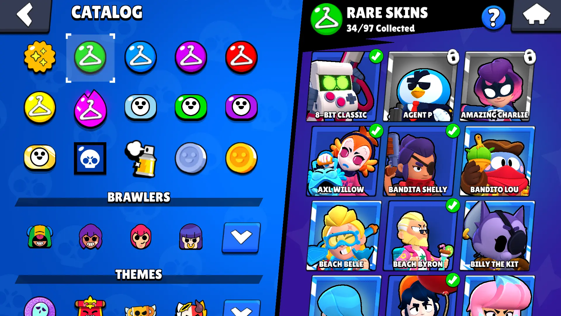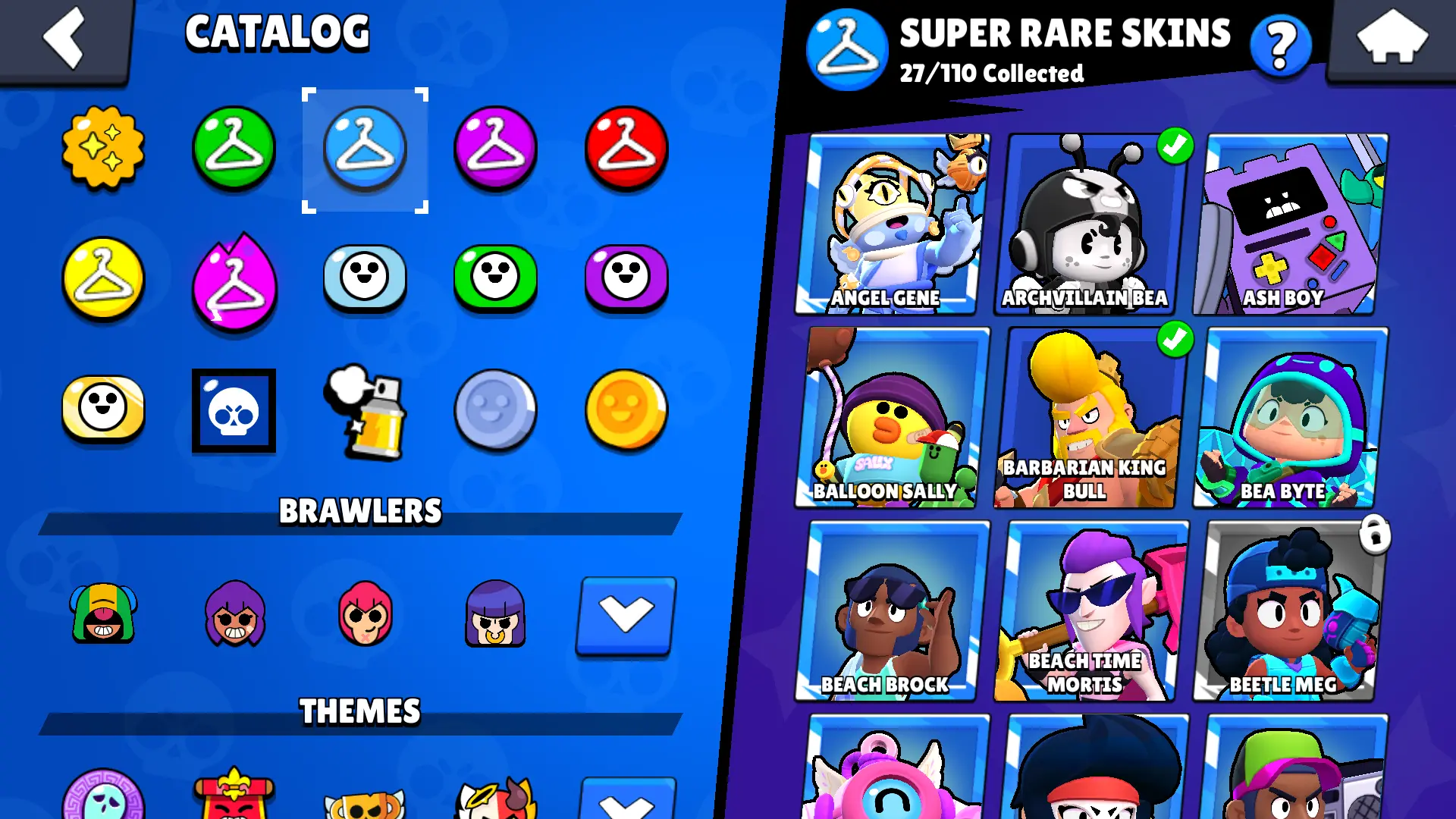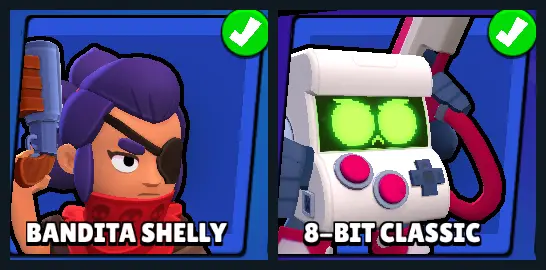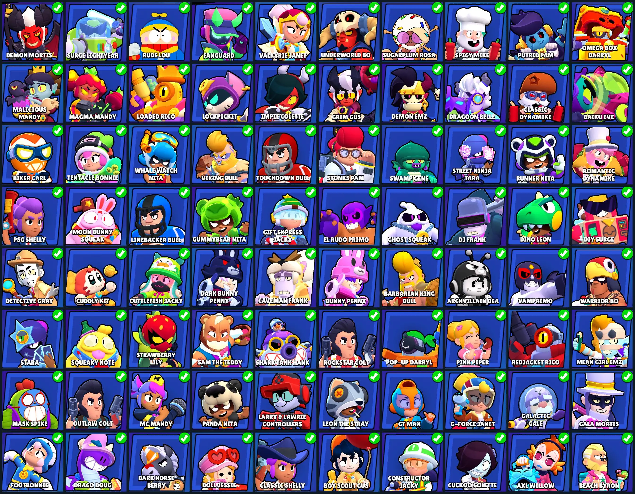 82 SKINS | 25342 TROPHIES | 8-BIT CLASSIC | ARCHVILLAIN BEA | AXL WILLOW | BAIKU EVE | BANDITA SHELLY | BARBARIAN KING BULL | BEACH BYRON | BIKER CARL | BOY SCOUT GUS | BUNNY PENNY | CAVEMAN FRANK | CLASSIC SHELLY | CONSTRUCTOR JACKY | 69 BRAWLERS