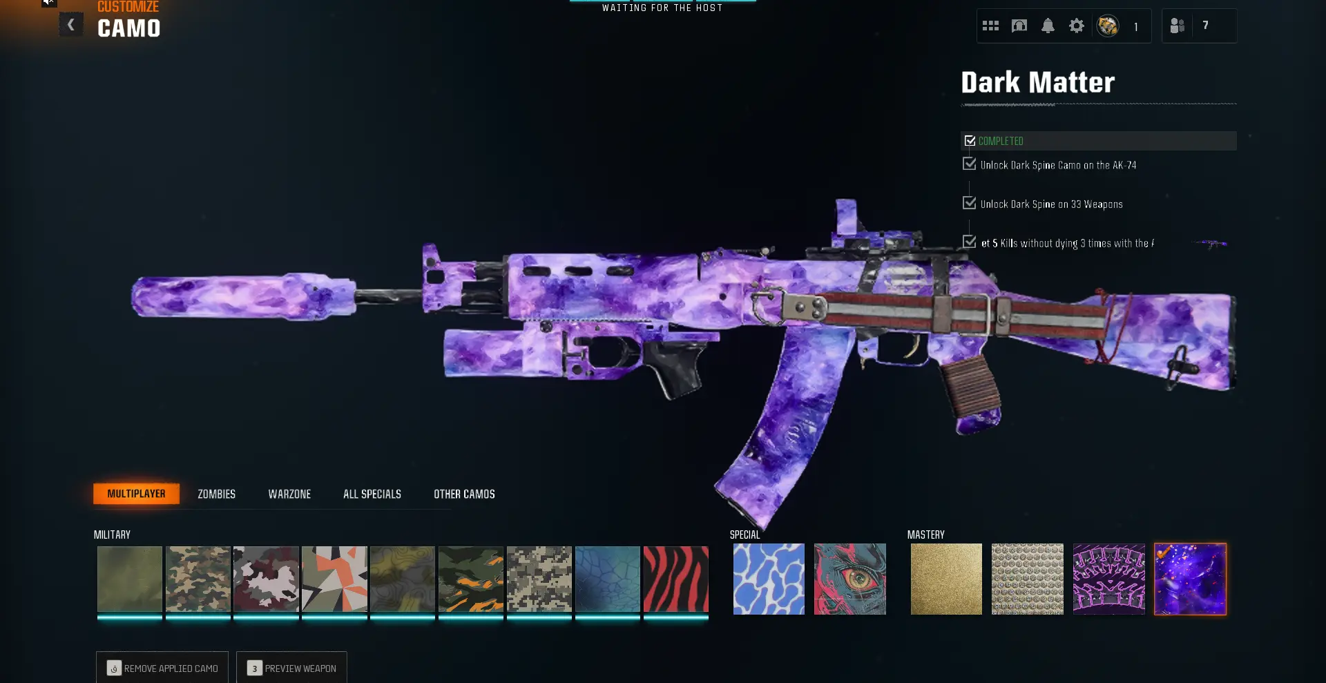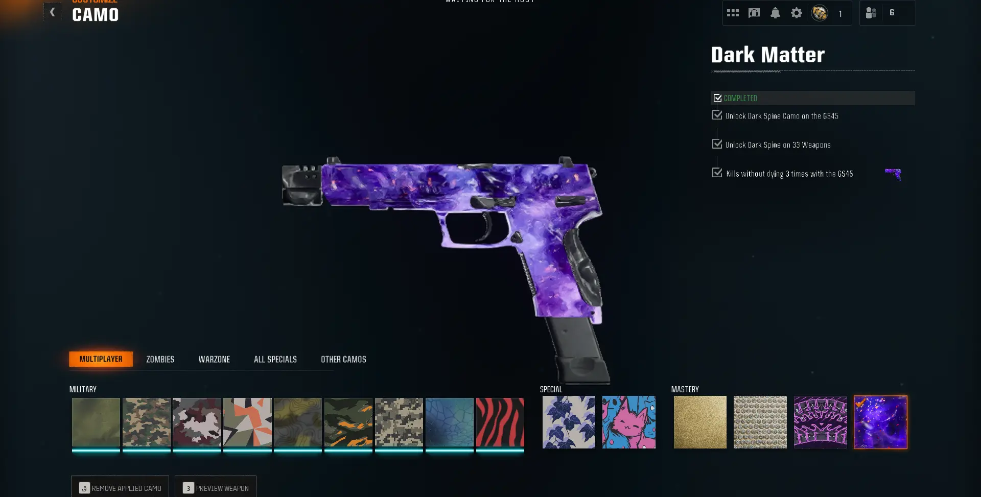 BO6 & WZ4 ⚔️ 38 Dark Matter + Prestige 4 ⚔️ + 500 Camos ⚔️ All Multiplayer Camos Unlocked 38 Weapons 💎 Level 55 🔥 16 Operators 🕸️ Dark Spine 💎 Diamond✨ Gold Camos 🦾 Prestige-Ready 🦾 Linkable to: Steam, Battle.net, PSN, Xbox 🌐 50 Wins Ranked Ready ⭐ RFR