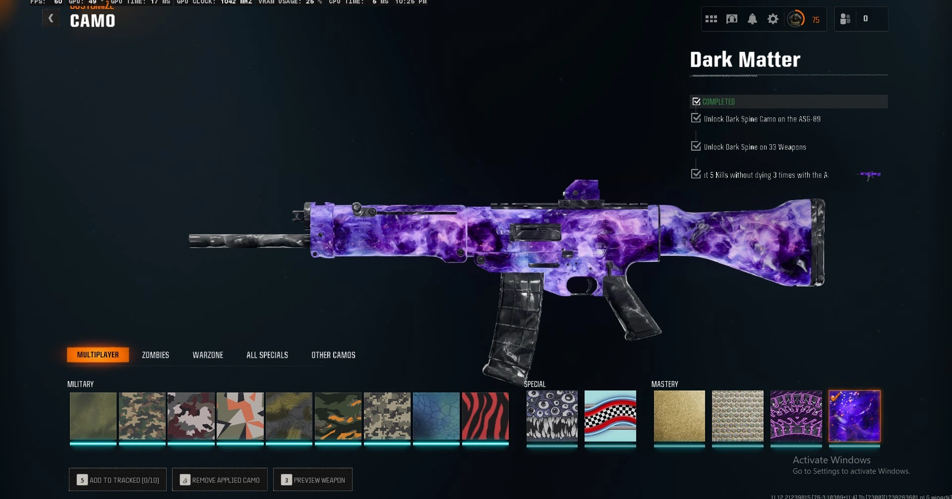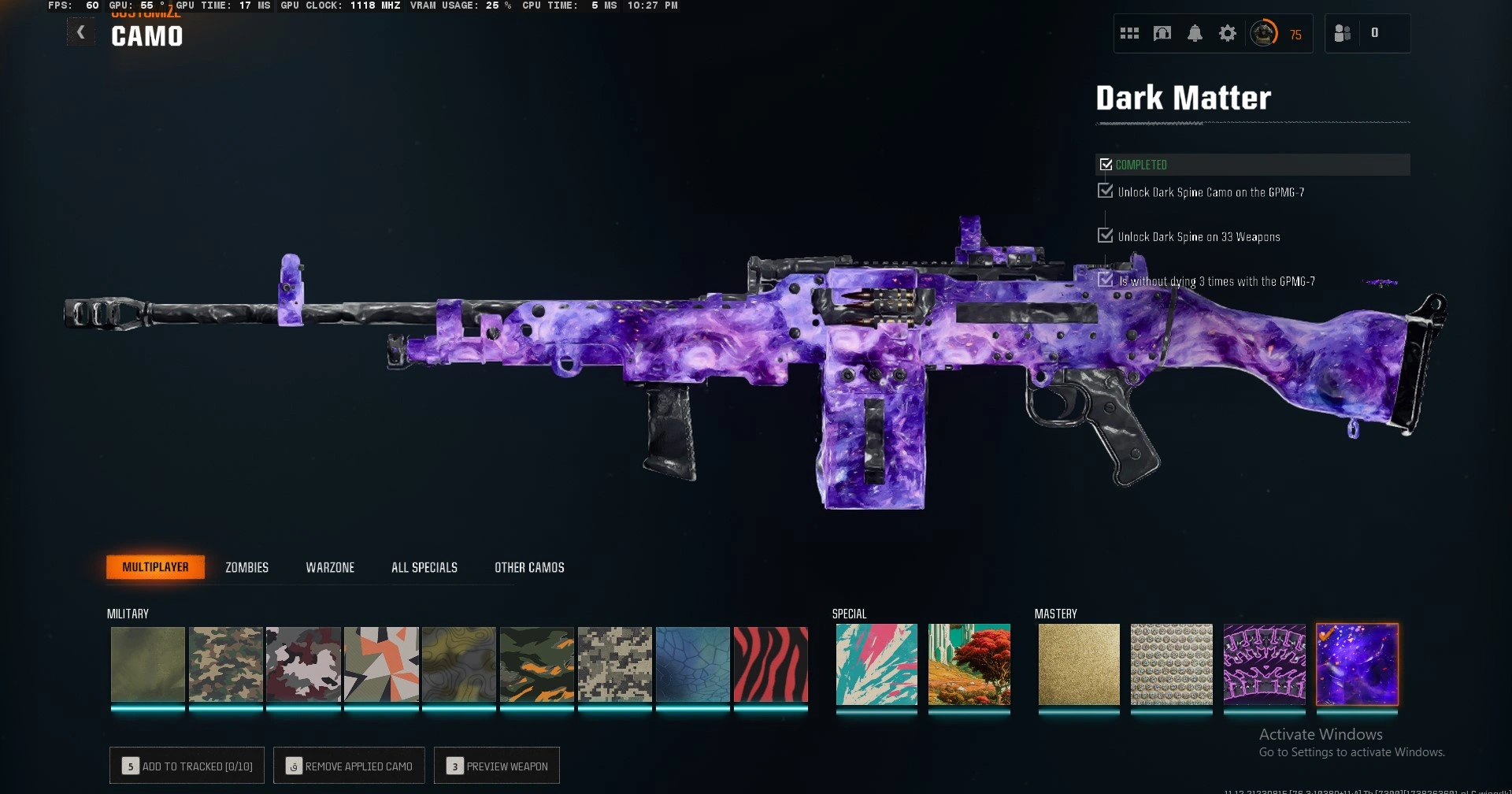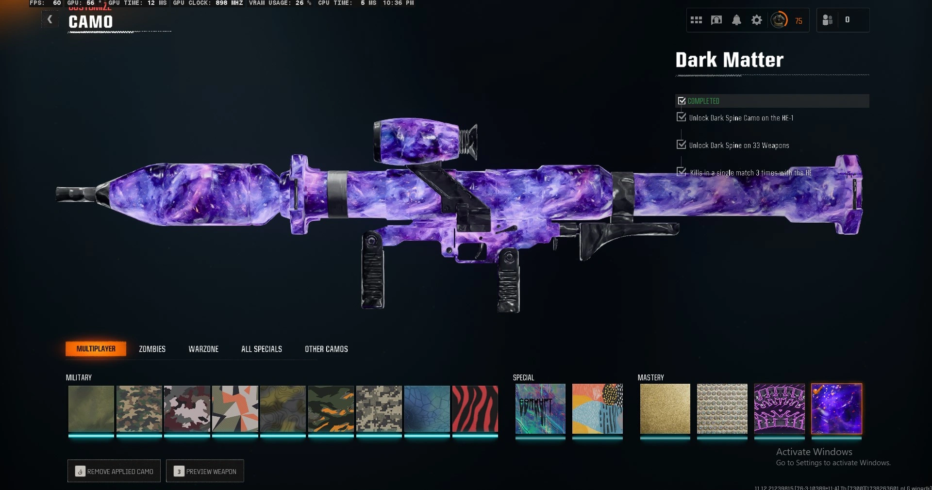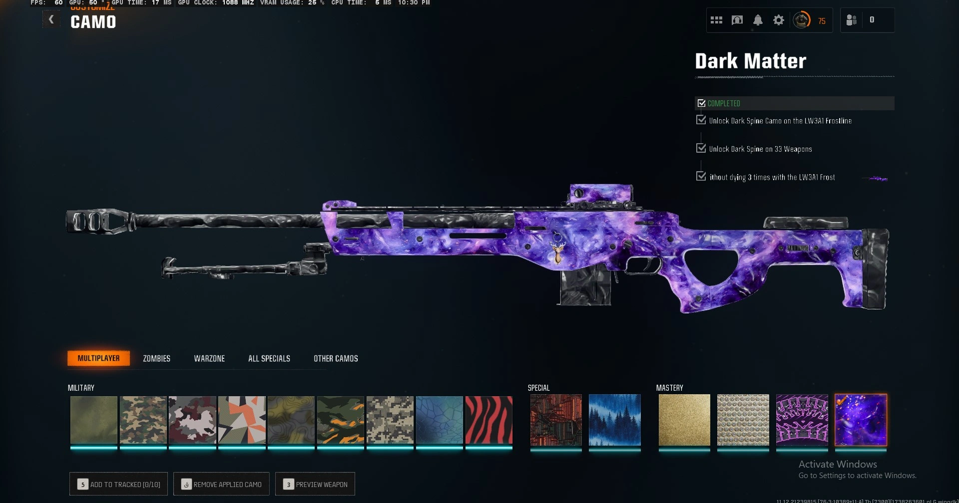 Dark matter 33 ⚡ Level 55 ⚡ 50 Wins ⚡ 495 Camos⚡ All Multiplayer Camos Are Unlocked on 33 Weapon💎 Level 55 🕸️ Dark Spine 33 ⚡ Diamond 33 ⚡ Gold Camos 33 💎 Linkable to: Steam, Battle.net, PSN, Xbox 🌐 Black Ops 6