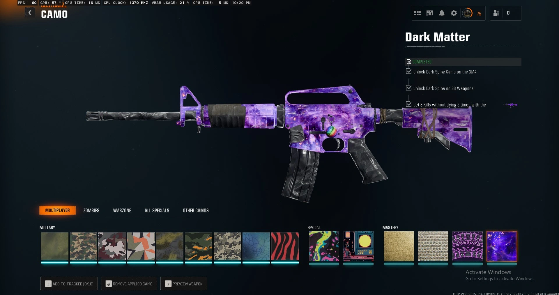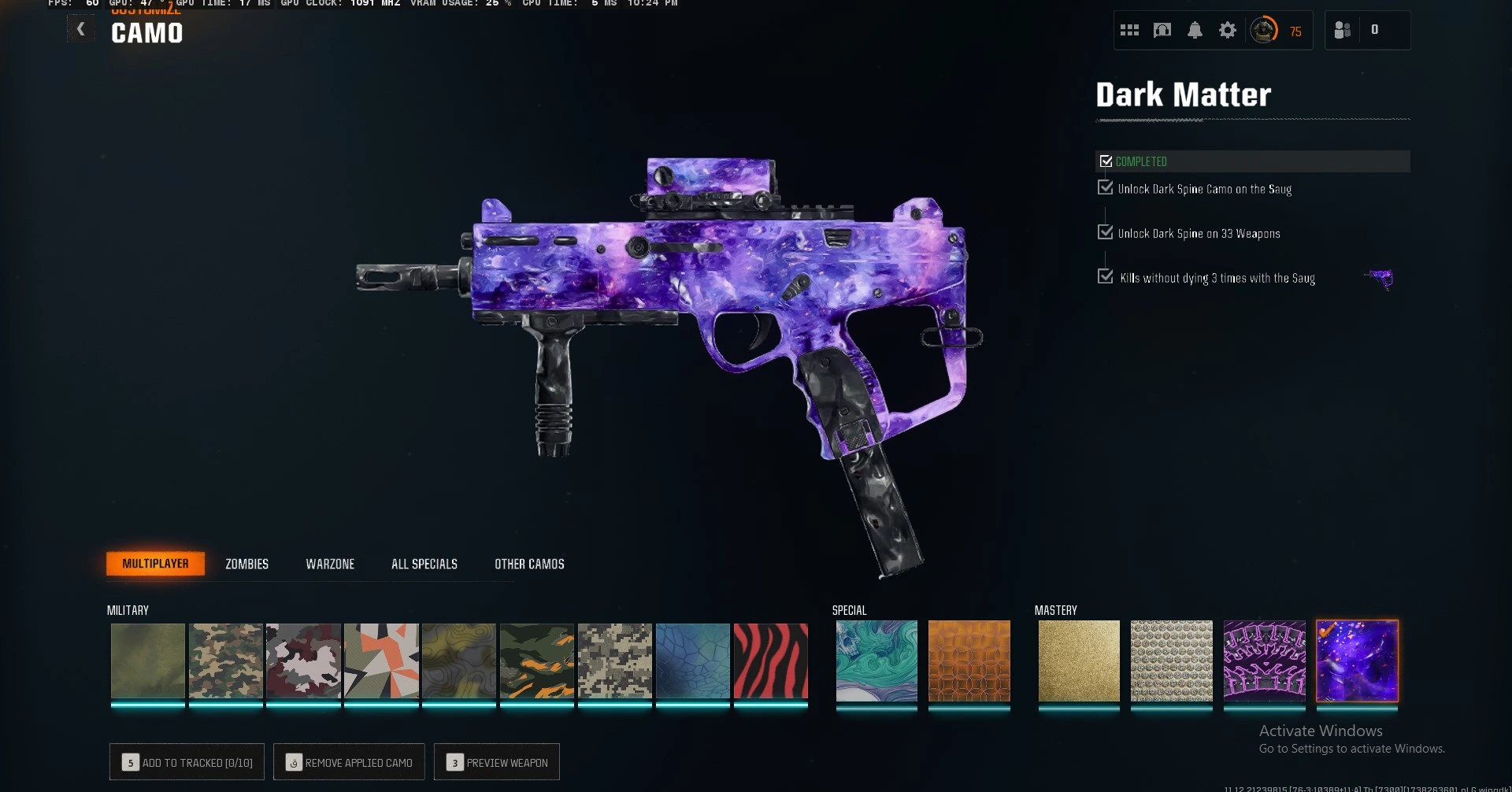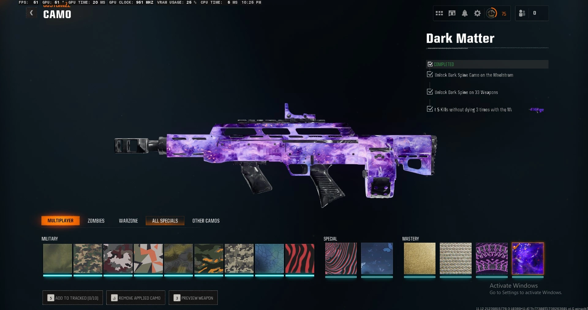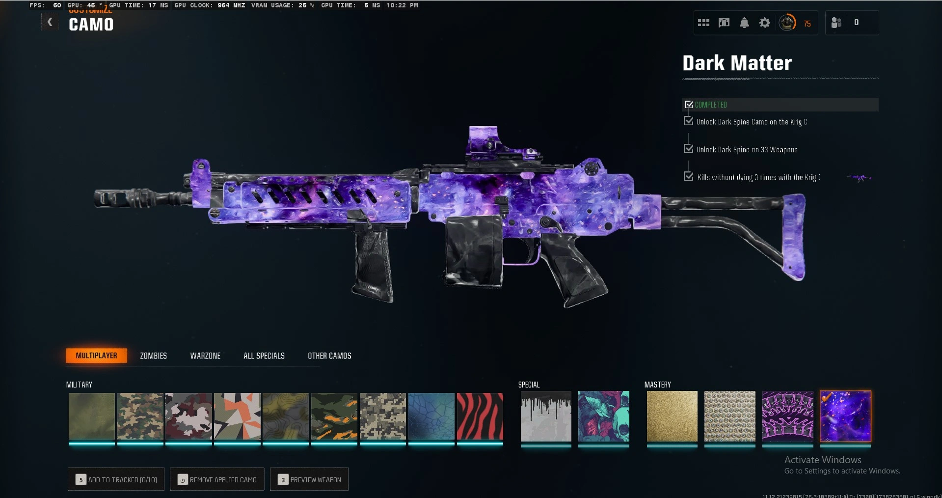 Dark matter 33 ⚡ Level 55 ⚡ 50 Wins ⚡ 495 Camos⚡ All Multiplayer Camos Are Unlocked on 33 Weapon💎 Level 55 🕸️ Dark Spine 33 ⚡ Diamond 33 ⚡ Gold Camos 33 💎 Linkable to: Steam, Battle.net, PSN, Xbox 🌐 Black Ops 6