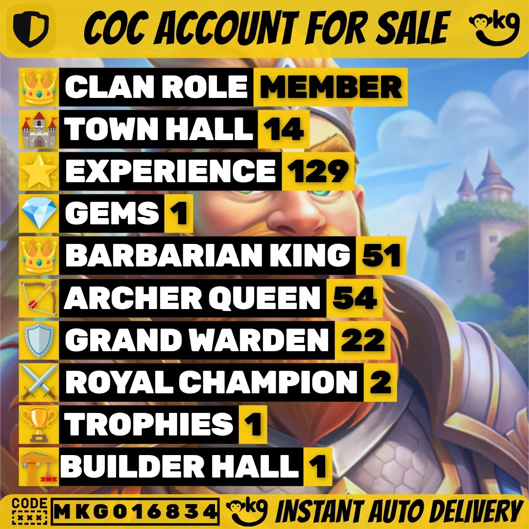 🏰 TH14 🏗️ Semi Max | 💎 — | 📈 Lvl 129 | 🦸♂️ Heroes 51/54/32/22/2 | 👕 3 Skins | ⚔️ — | 💰 Nc 500 Gems | 📱 Android/iOS | 🆔 M3750 !MKG016834