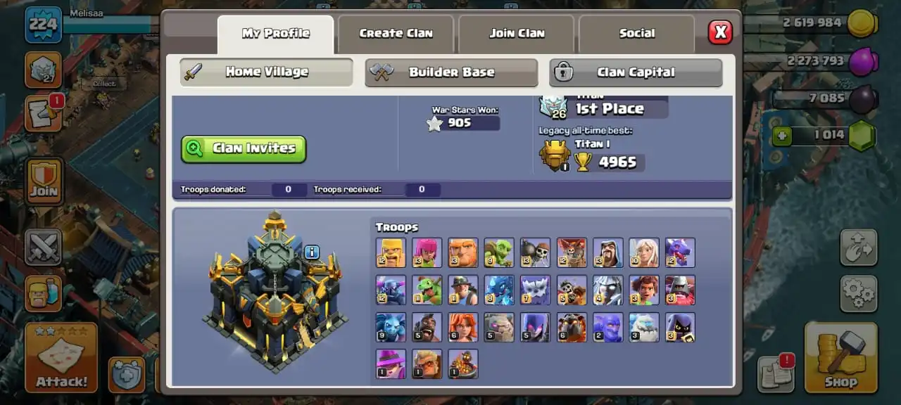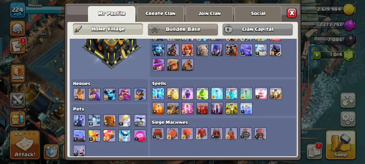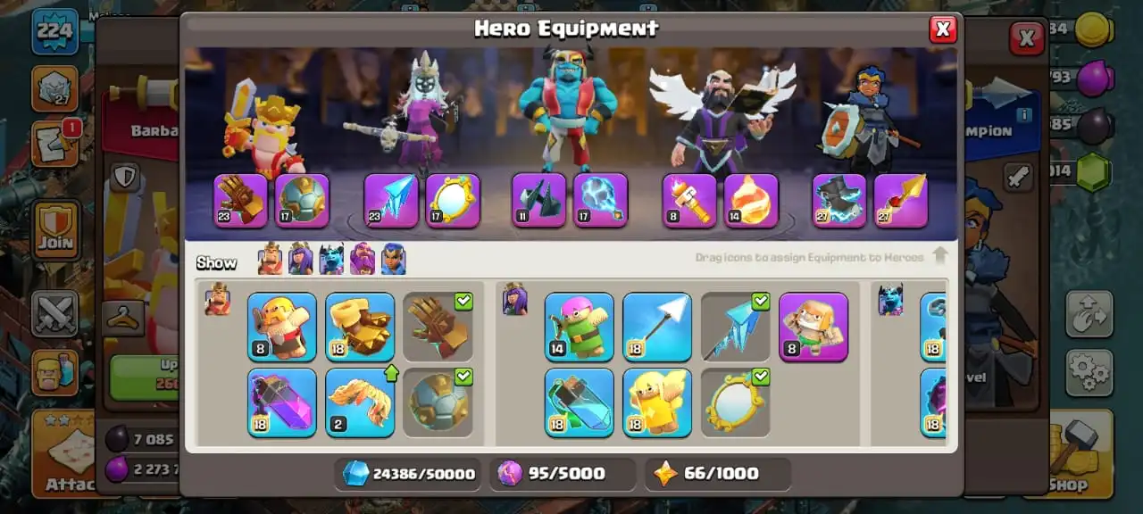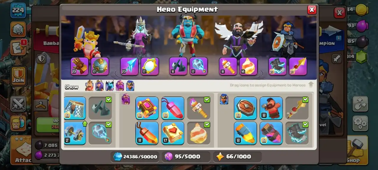 Big sale✅TH 17 max defense🔥high heroes level 88/100/90/75/50☠️max electro boots and rocket spear⚒️max builder base✅high seas scenery and 13 heroes skin✅cn on