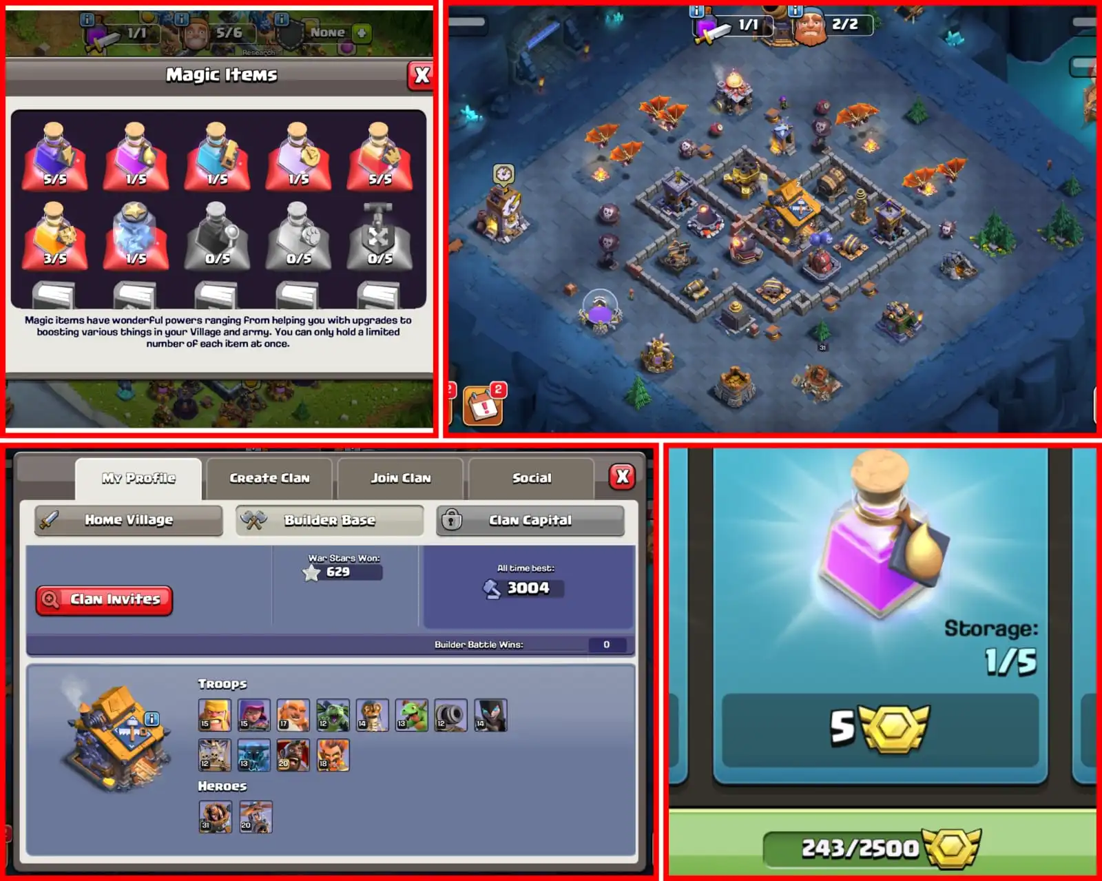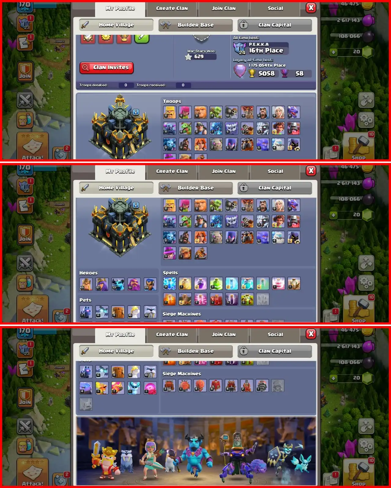 Max Equipments ACC | [ SB+FB ] Max Lvl | [ EB+RS ] 23 Lvl | 88 Lvl Queen | High Lvl Heros | Decent Base n walls | High Profile | Medels n items loaded | Best for war | Rest Epics Very high |