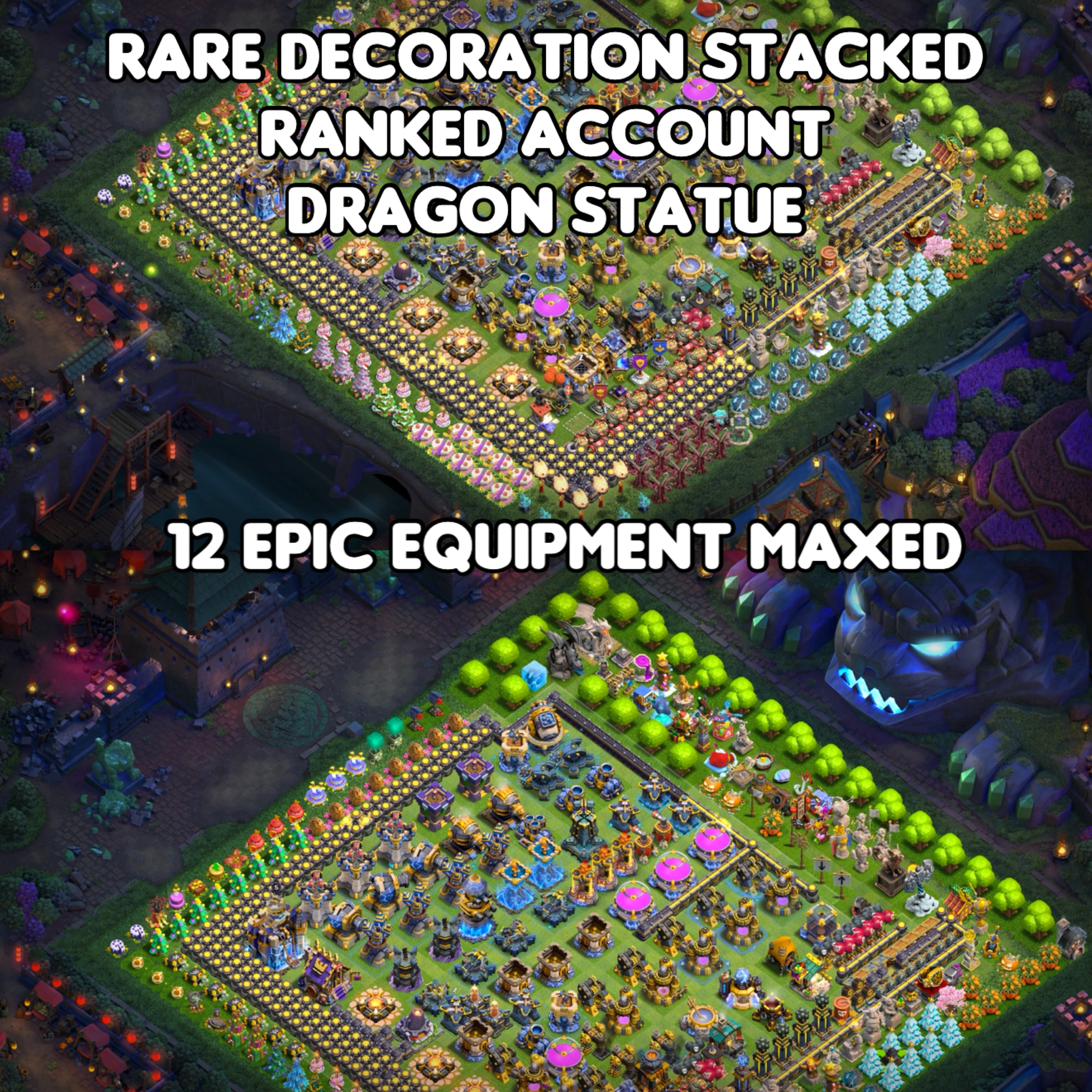 Rarest Stacked Obstacles 💎 TH 18 Maxed Almost 😱 12 Epic Maxed Equipments 🤫 Dragon Statue 🌹 Decoration ❌ Ranked Account 💕 Instant Delievery
