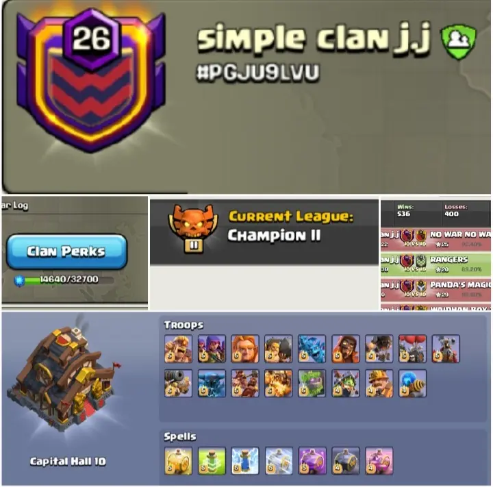 Champion 2 __ Clan name- Simple Clan jj __Clan LvL- 26+ __Capital hall- 10 __ Win- 536 _loss- 400 __ Fully Troops max __fast Delivery