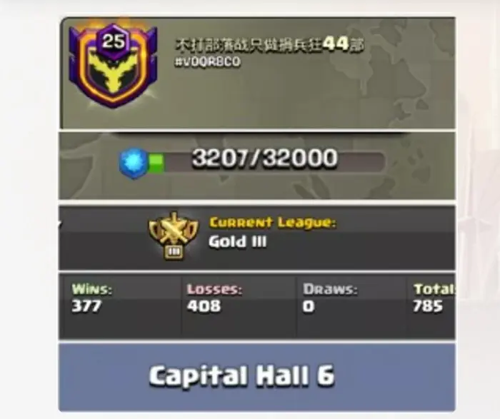 Clan name- Chinese __Clan LvL- 25+ __ Gold 3 __Capital hall- 6 __ Win- 377 _loss- 408 __ Troops max __ Rear Name __fast Delivery