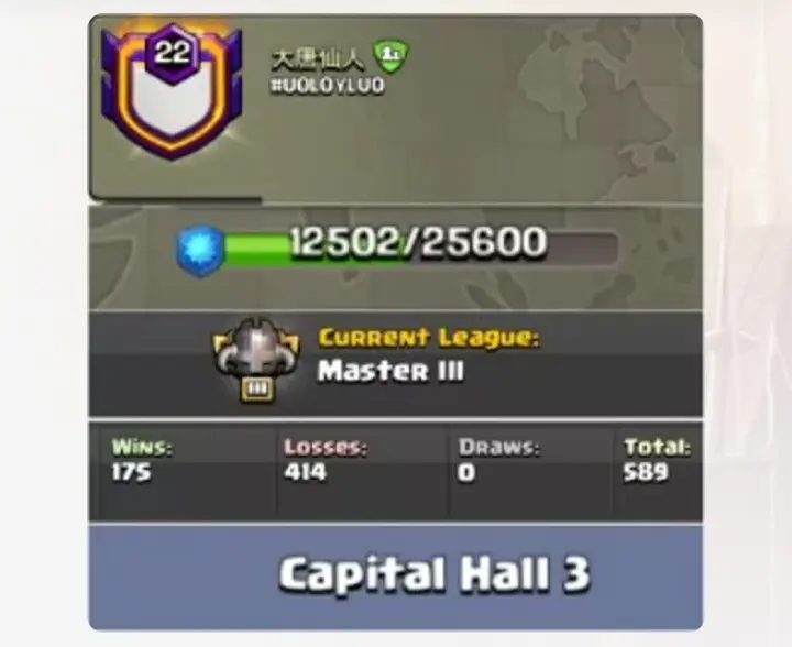 Clan name- Chinese __Clan LvL- 22+ __ Master 3 __Capital hall- 3 __ Win- 175 _loss- 414 __ Troops max __ Rear Name __fast Delivery