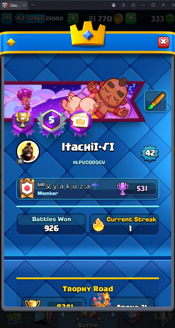 8241 TROPHY 🏆 42 LVL 💯 KT 14 👑 119 CARDS ♦️ 4 MAX CARDS 👑 1 ELITE CARDS 🔮 7 EVO 💯 EMOTE 46 🎭 #LPVCQ0QGV ⸱ TAG ACCOUNT ♥️