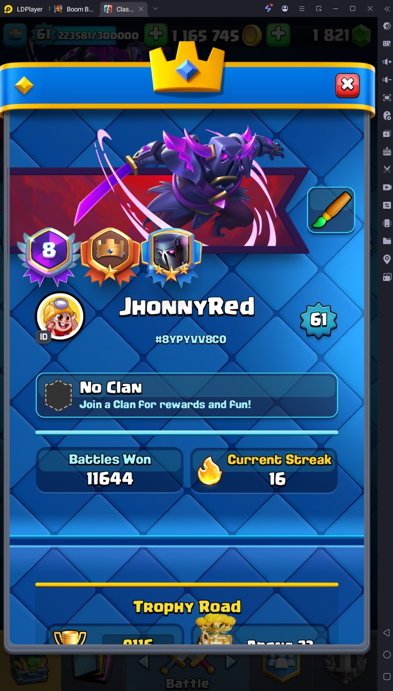 9116 TROPHY 🏆 ULTIMATE CHAMPION KING EMOTE 🧡 GOBLIN KISS TROPHY EMOTE 🧡 61 LVL 💯 KT 15 👑 119 CARDS ♦️ 91 MAX CARDS 👑 29 ELITE CARDS 🔮 13 EVO 💯 EMOTE 180 🎭 #8YPYVV8C0 ⸱ TAG ACCOUNT ♥️
