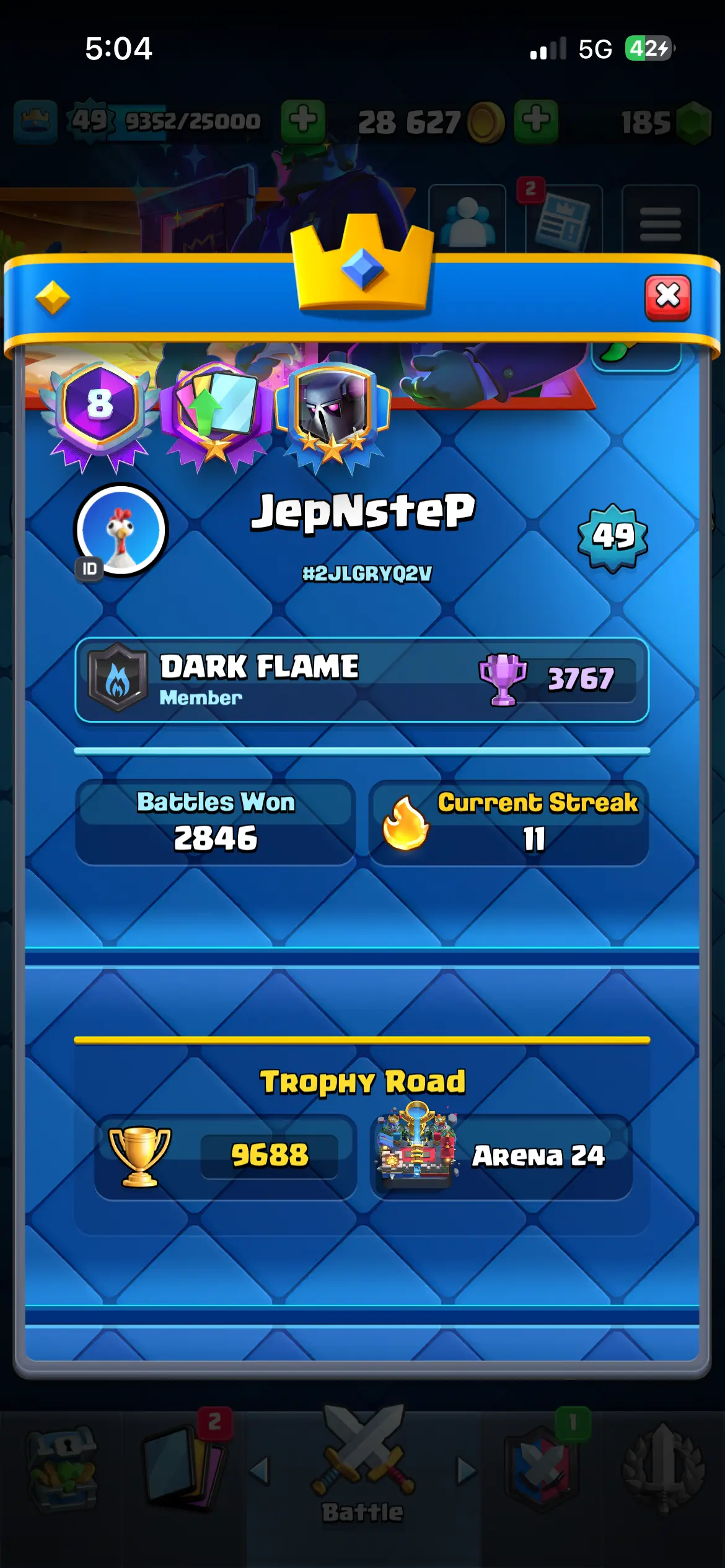 👑 ARENA 24 ACCOUNT 🔥 | 16 MAXED CARDS + 3 MAX LEVEL 15 EVOS (Royal Giant, Log, Archer Queen) 🥳 | HIGH 9688 TROPHIES 🏆 | Level 49 | 185 GEMS Available 💎 | INSTANT DELIVERY