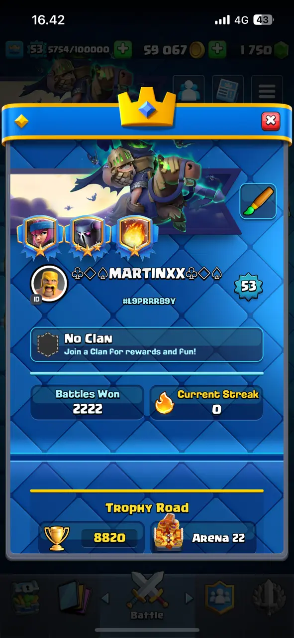 🔥 [-CHEAPEST-] 🔥 CR Lv.53 🔥Change Name ON🔥Arena 22🔥8820 Trophy🔥KT 14🔥9 Evo Cards🔥26 Max Cards & 4 Elite🔥72 Emotes🔥11 Tower Skins🔥Full Acces & Guaranteed🔥[F2163]🔥