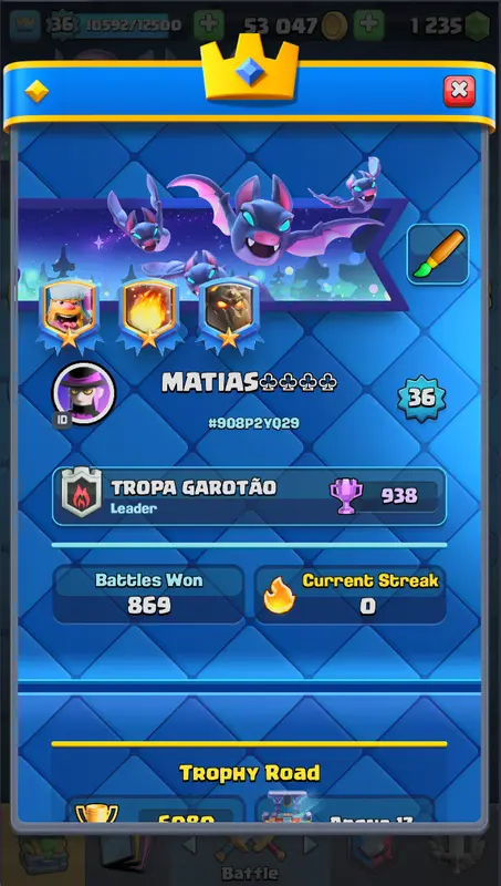 CL6188 KT 12 LEVEL 36 | Trophies:6080 | 115 Cards | 5 Cards (14LVL) | 3 Tower Skins | 29 Emotes | 53K Gold | 1235 Gems | IOS/ANDROID