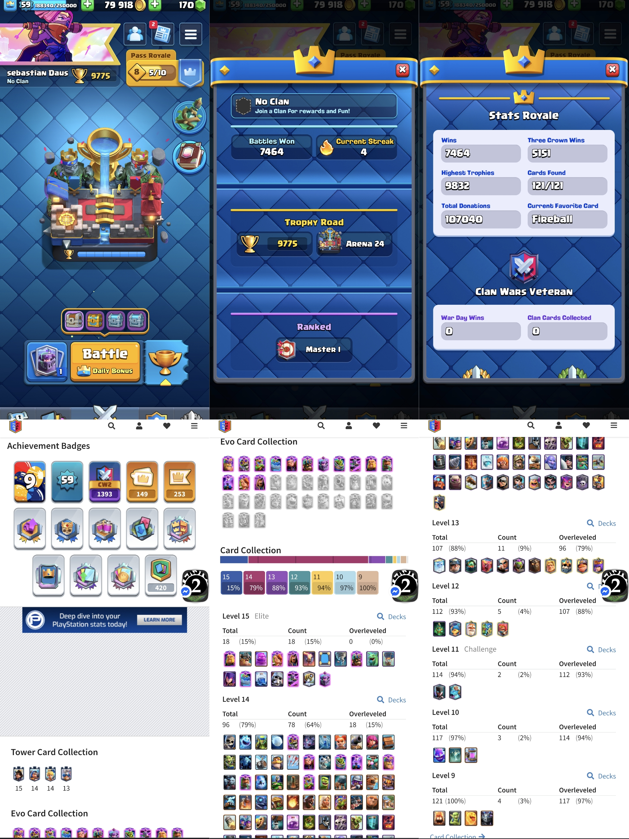 KT15 LVL59 | 121 CARD | 18 ELITE | 78 MAXED | ARENA 24 | 14 EVOLUTION | 9775 TROPHY | 149 RARE EMOTE | FULL ACCESS