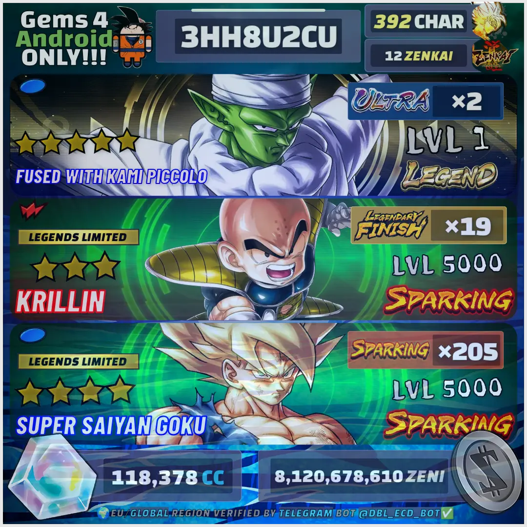 👑 WHALE Legends Collection: [📱 Platform: Android, 👤 Characters: 389, 🌟 Ultra: 2, ⚔️ Sparking: 202, 💎 Crystals: 118378, 👑 Limited: 18, ⚡ Zenkai: 10] ⸱ PREMIUM COLLECTION | GUARANTEED SAFE !AGG02464