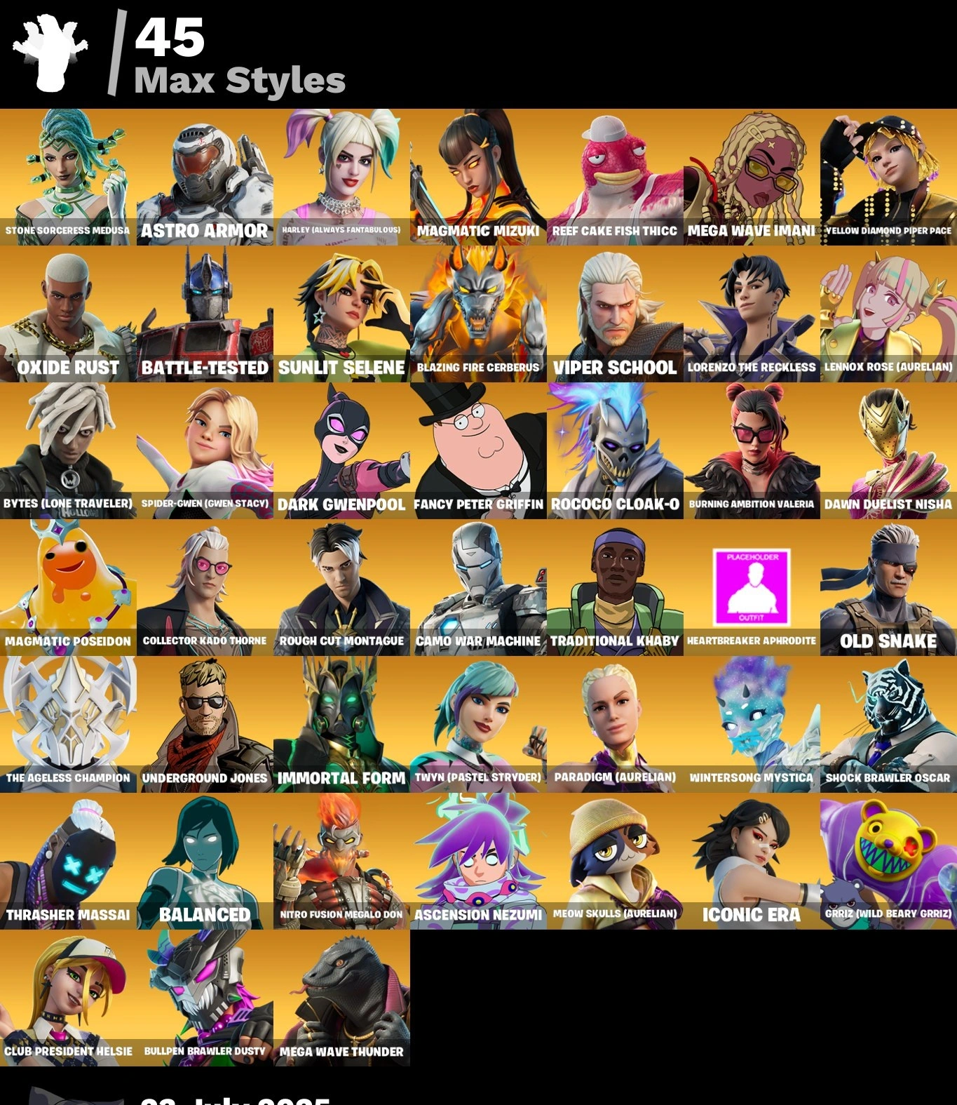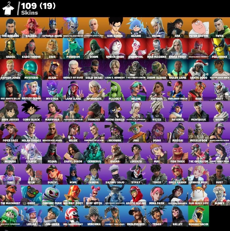 109 skins[PC/PSN/XBOX] Leon S. Kennedy | Eren Jaeger | Basic Basher | Ol' Woody | The Ageless | Valeria | Optimus Prime | Renzo the Destroyer | Paradigm (Reality-659) | Son Gohan | Daryl Dixon | Goku Black – Slayer Juice WRLD – Spider-Gwen – Satoru Gojo