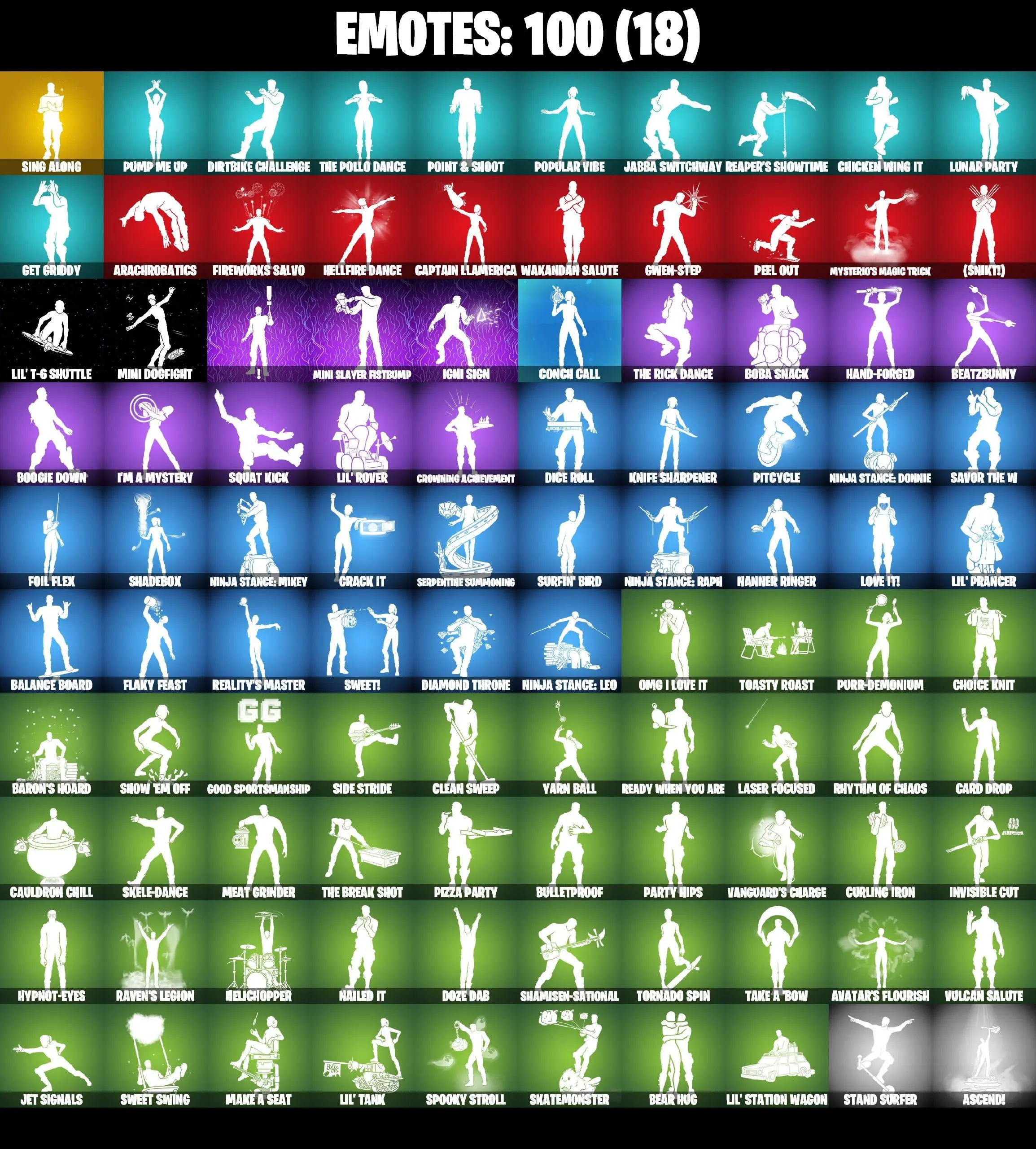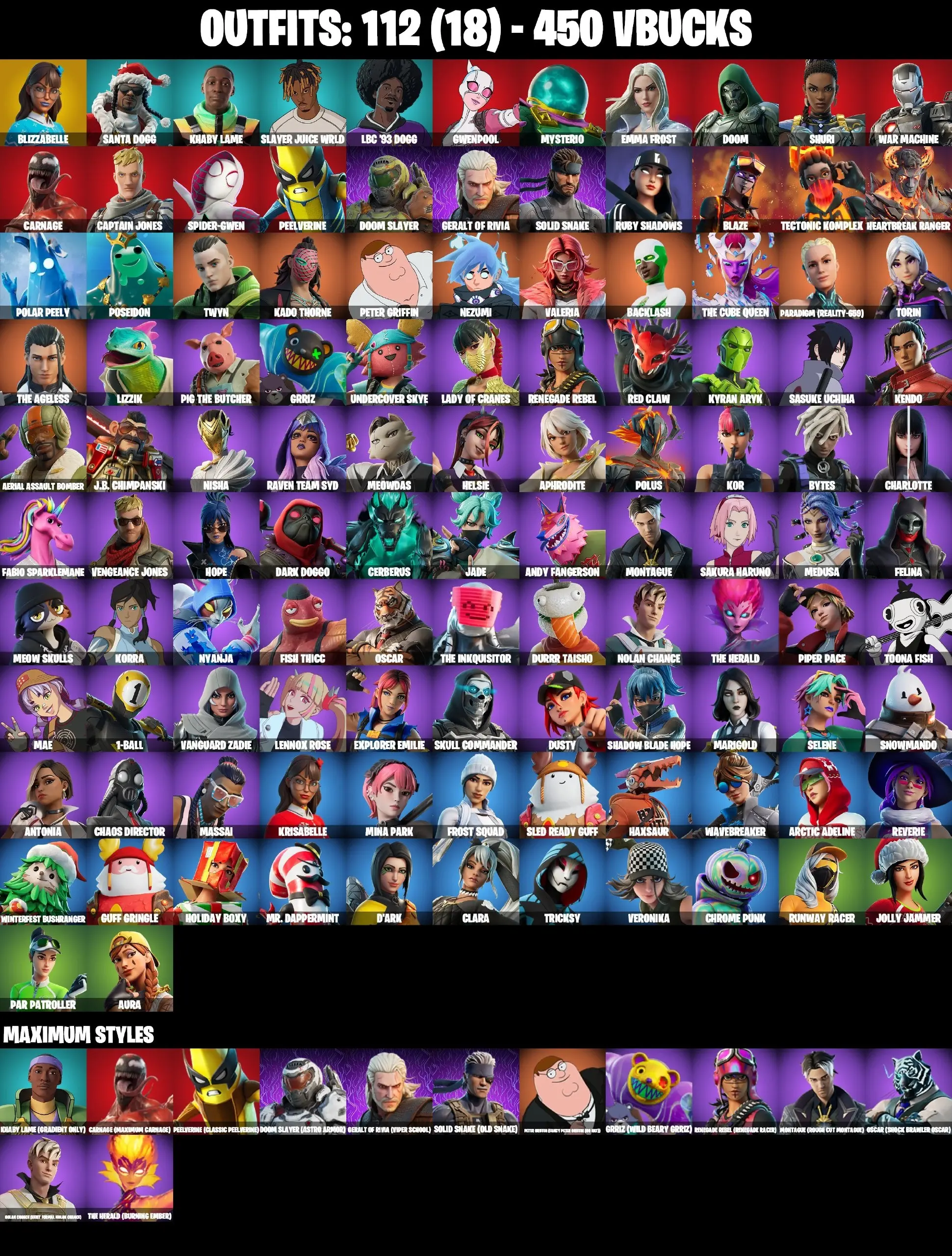 ❤️ 112 SKINS ❤️ BACKLASH ❤️ SPIDER-GWEN ❤️ MINA PARK ❤️ JABBA SWITCHWAY ❤️ GET GRIDDY ❤️ SASUKE ❤️ SAKURA HARUNO ❤️ LADY OF CRANES ❤️ HELSIE ❤️ CHARLOTTE ❤️ REVERIE ❤️ AURA ❤️ MEOW SKULLS ❤️ WAVEBREAKER ❤️ JOLLY JAMMER ❤️
