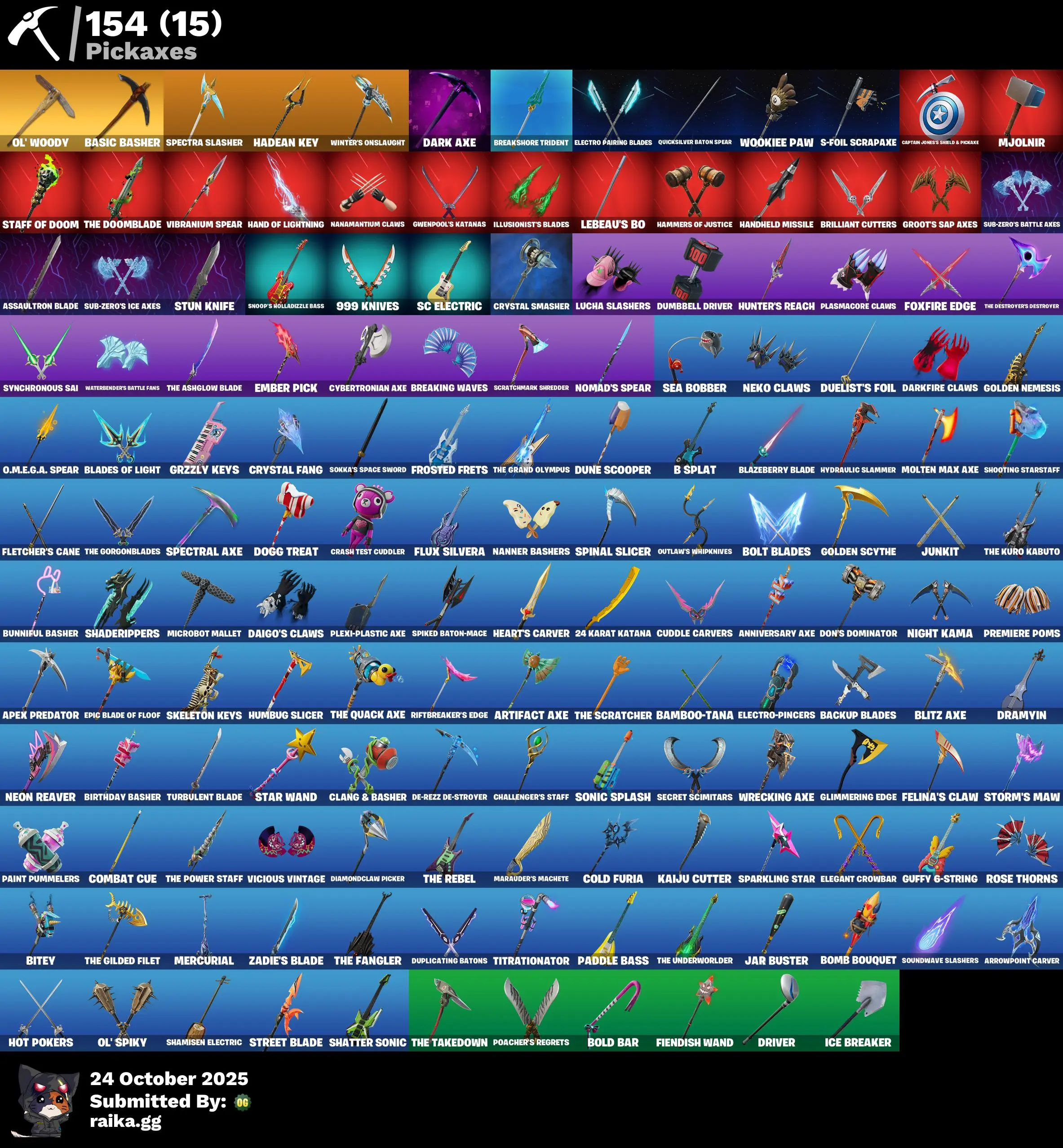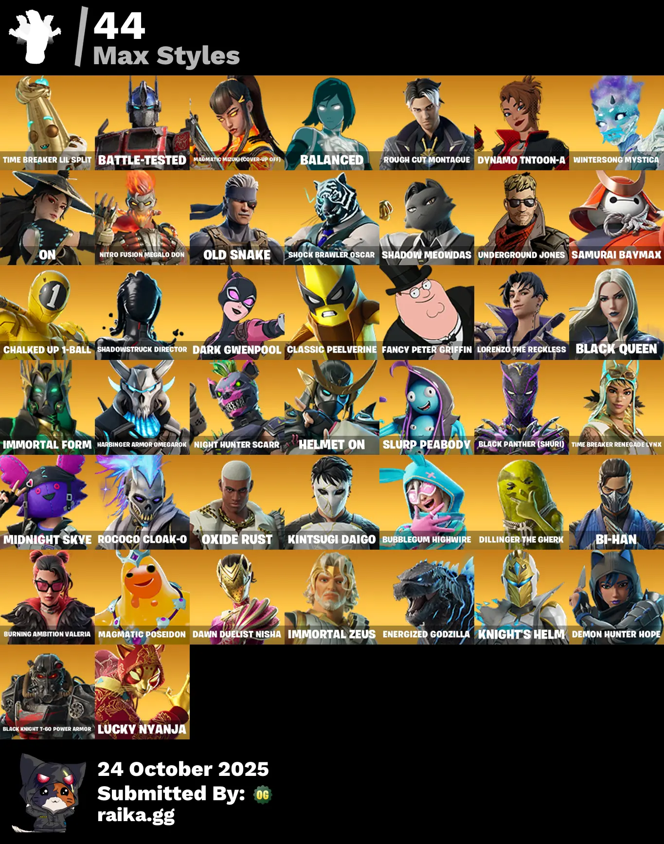 113 skins | Doom🎃Mizuki🎃Poseidon🎃Dark Jonesy🎃Storm🎃Peter Griffin🎃Omegarok🎃Spectra Knight🎃Hades🎃Era🎃Neo Versa🎃Renzo the Destroyer🎃Dark Red Knight🎃Valeria🎃Hunter🎃Renegade Raider🎃Shuri🎃Joltara🎃Tempest🎃Dark Wild Card🎃Optimus Prime D5187