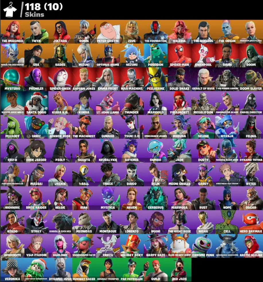 118 SKINS βΈ± For all platforms, Email Changeable, Joltara | Zeus | Gwenpool | Nyanja | Cell | P33LY | Chaos Director | Carey | Helsie | Mysterio | Highwire | NeuraLynx | Jade | Frieza | Harpy Haze