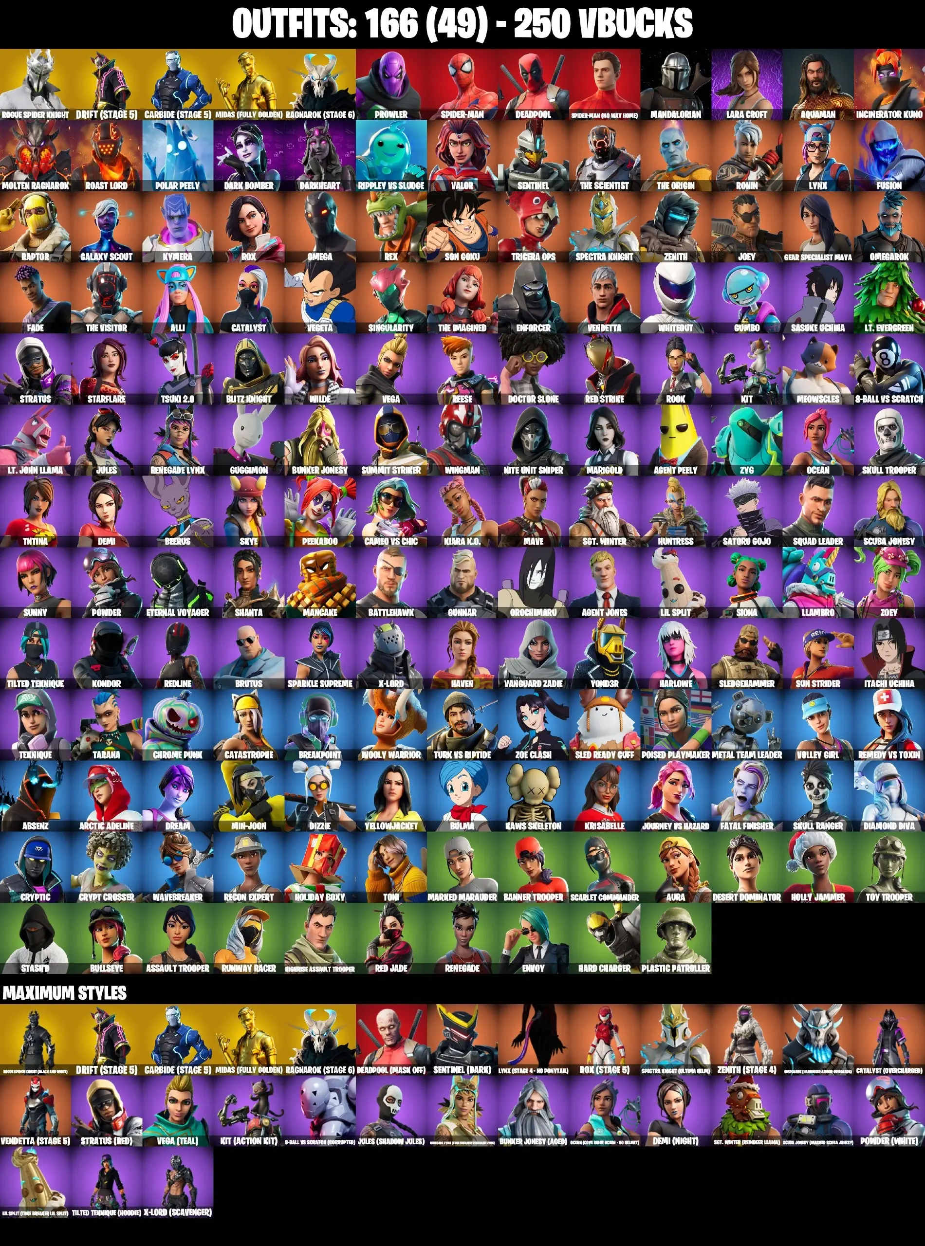 166 SKINS | ROGUE SPIDER KNIGHT MAX | FRESH | LARA CROFT | MANDALORIAN | SPIDER-MAN NO WAY HOME | SPIDER-MAN | OMEGA | TOY TROOPER | PLASTIC PATROLLER | CATALYST MAX | ORANGE JUSTICE | CANDY AXE | SON GOKU | VEGETA | SASUKE | OROC