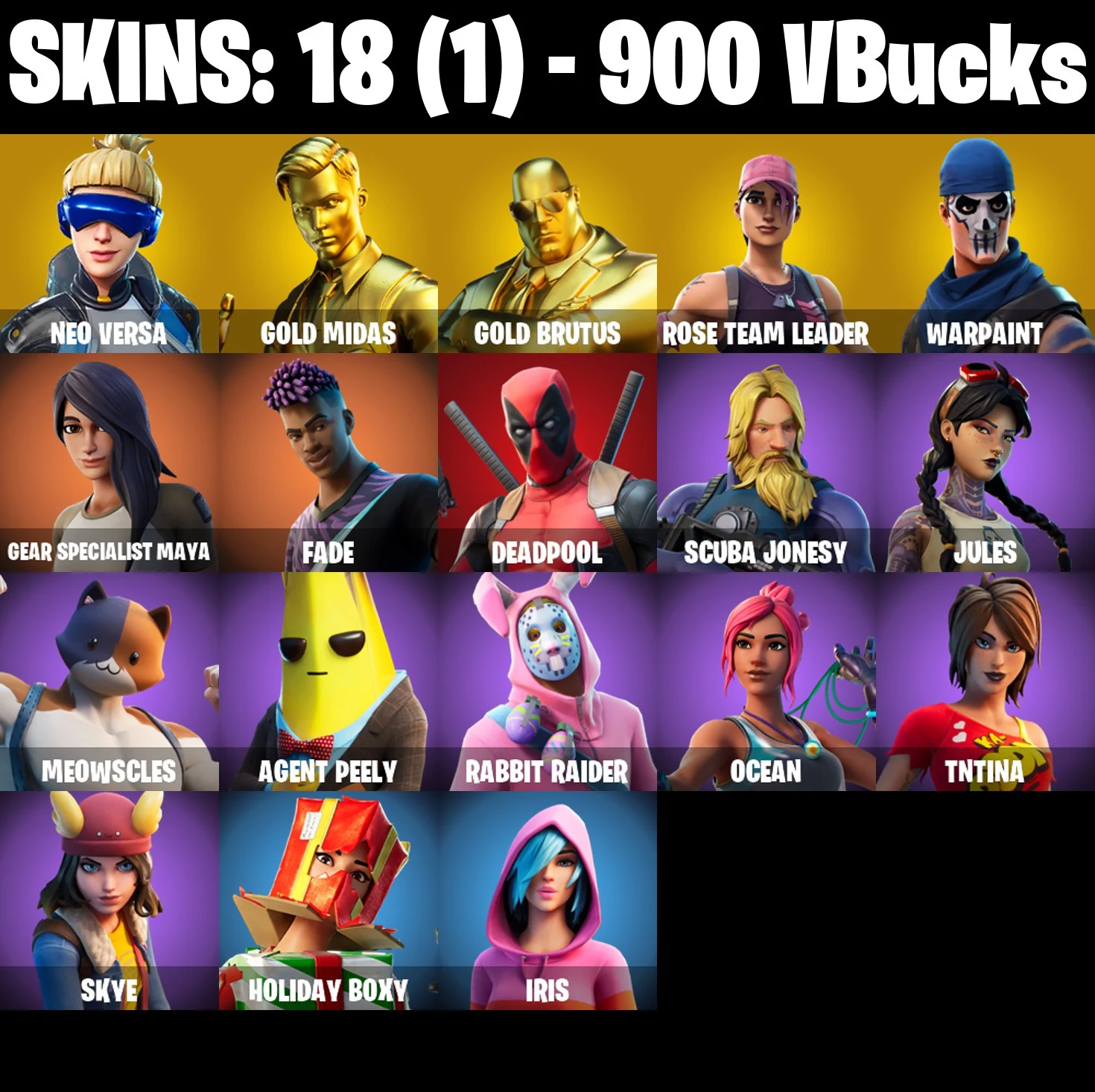 🎆18 SKINS ⚡️PC/XBOX⚡️ NEO VERSA 👑 GOLD MIDAS 👑 GOLD BRUTUS 👑 GEAR SPECIALIST MAYA 👑 FADE 👑 DEADPOOL 👑 SCUBA JONESY 👑 JULES 👑 MEOWSCLES ⚡️ 900 VB #M654