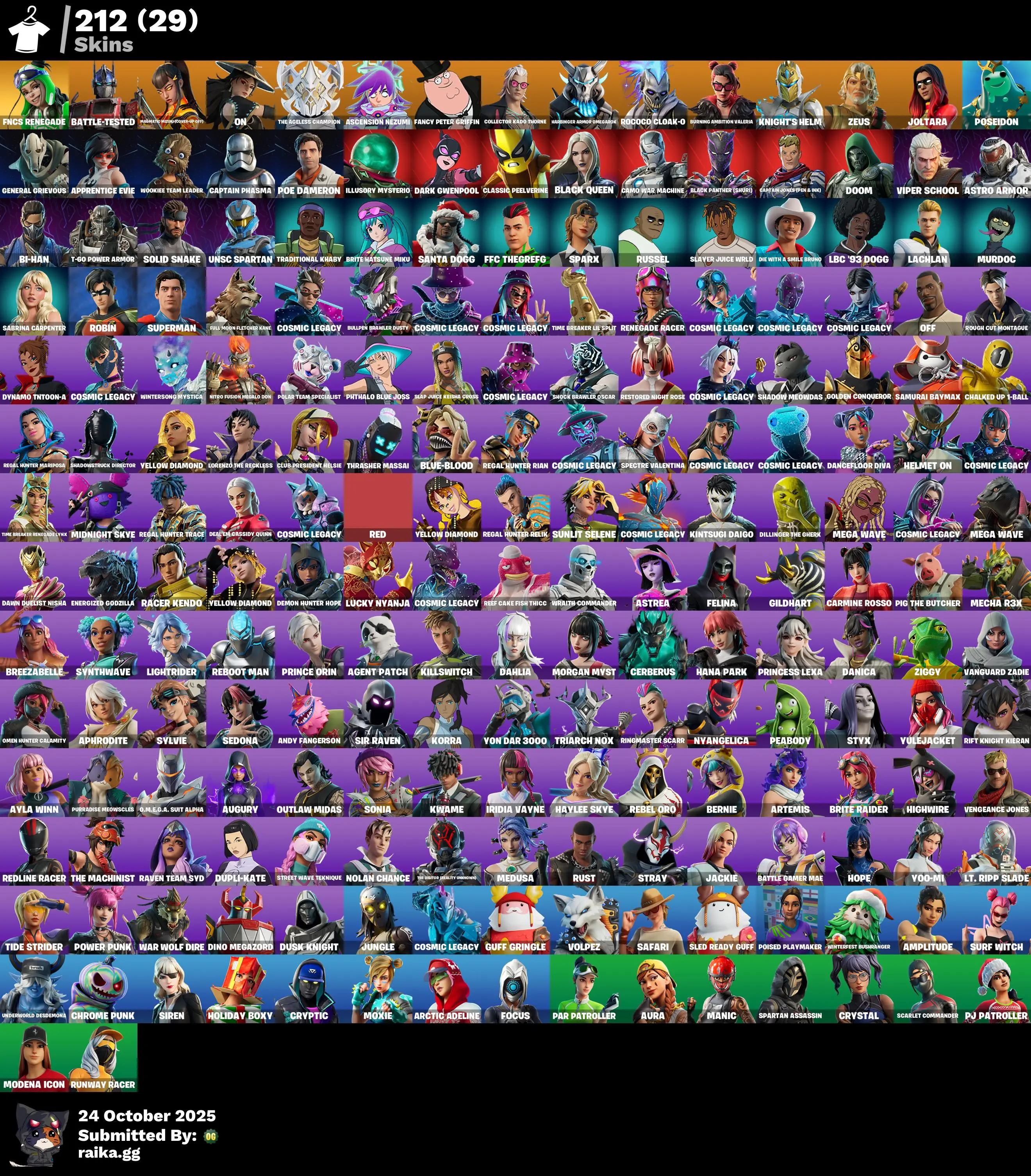 203 skins | Kado Thorne🎃Poe Dameron🎃Valeria🎃Era🎃Nezumi🎃Optimus Prime🎃The Ageless🎃Captain Phasma🎃Omegarok🎃Wookiee Team Leader🎃Spectra Knight🎃Joltara🎃FNCS Renegade🎃Peter Griffin🎃General Grievous🎃Poseidon🎃Mizuki🎃Renzo the Destroyer D5197