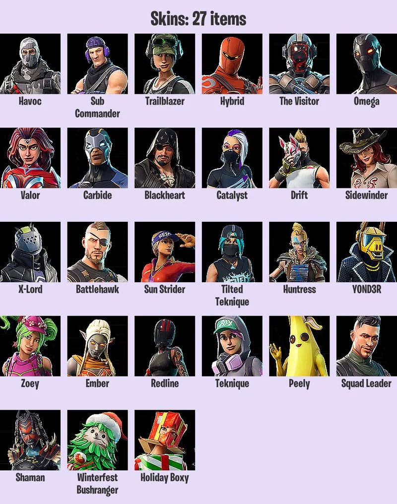 27 Skins|Havoc|Sub Commander|Trailblazer|Hybrid|The Visitor|Omega|Valor|Carbide|Blackheart|Catalyst|Drift|Sidewinder|X-Lord|Battlehawk