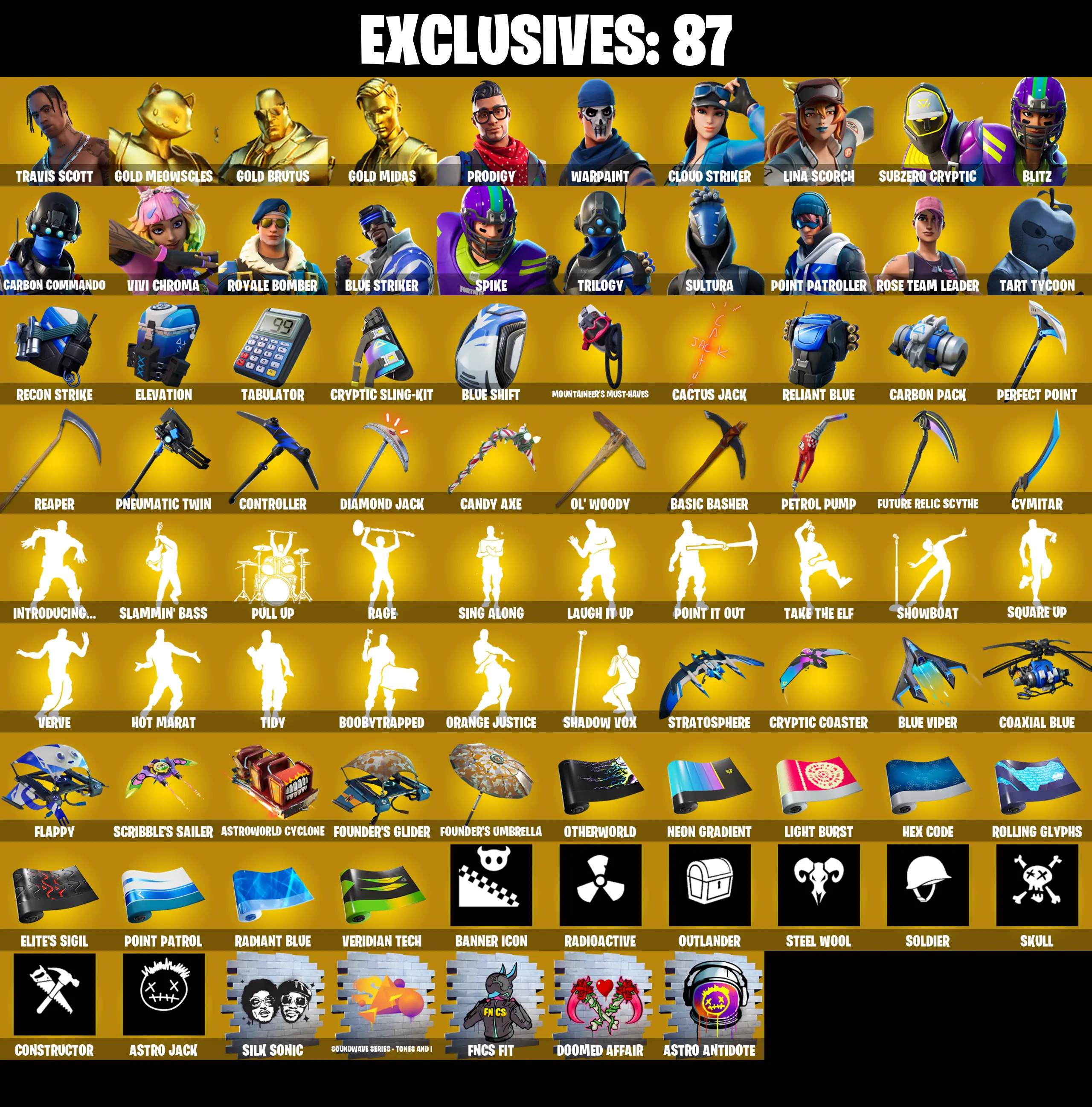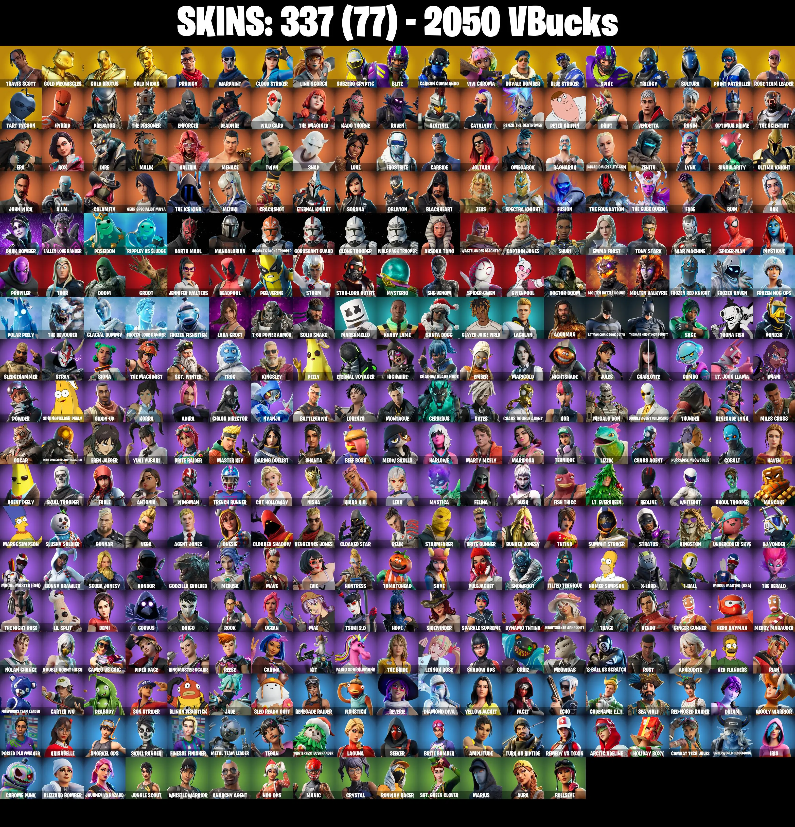 337 SKINS ✨ Travis Scott ✨ Gold Meowscles ✨ Gold Brutus ✨ Gold Midas ✨ Prodigy ✨ Cloud Striker ✨ Lina Scorch ✨ 2050 VB (PC/PSN/XBOX) OG STW