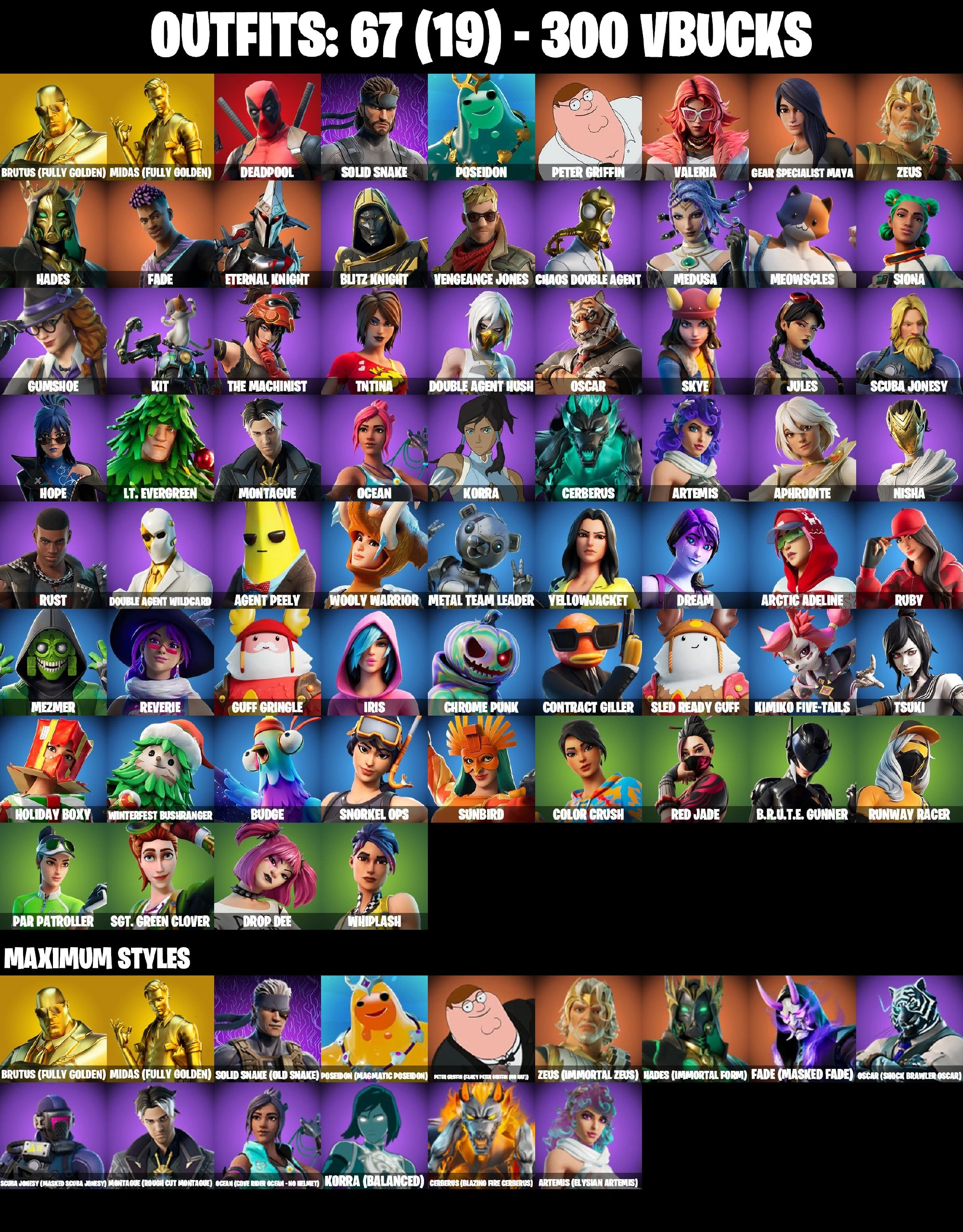 67 SKINS | CRAZYBOY | WHIPLASH | GOLDEN MIDAS | LAUGH IT UP | ARTEMIS MAX | MAYA | JULES | REVERIE | TSUKI | AGENT PEELY | PAR PATROLLER | PEPPERMINT PICK | CAN PLAY ON PSN,XBOX,PC,NINTENDO,MOBILE | 300 VBUCKS | FULL EMAIL ACCESS