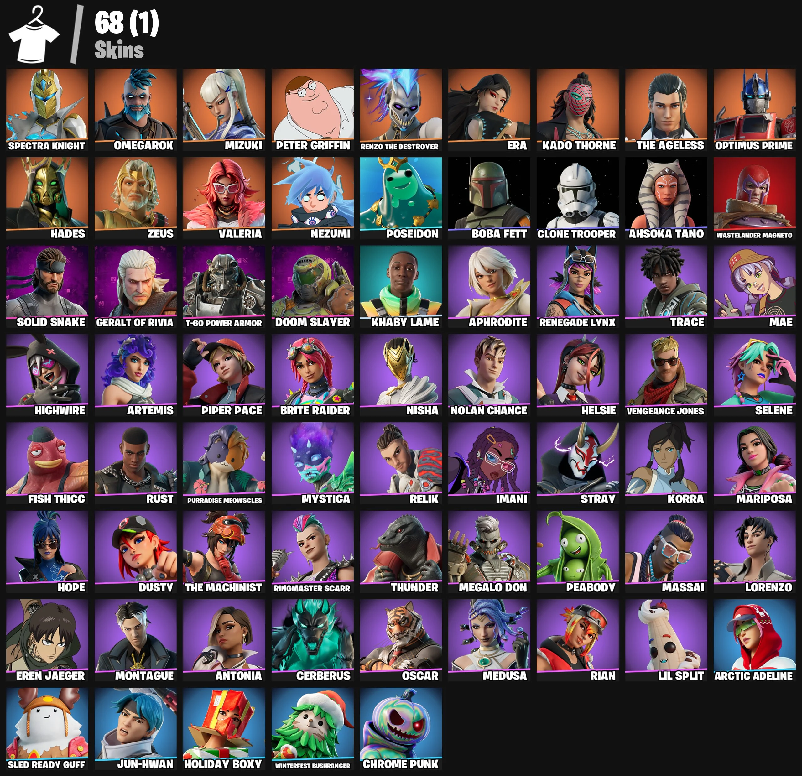 🎭 【68 SKINS】 (PC/XBOX) GERALT OF RIVIA 🛡️ SPECTRA KNIGHT 👾 OMEGAROK 🌌 MIZUKI 💎 PETER GRIFFIN 🔫 RENZO THE DESTROYER ⚡ ERA