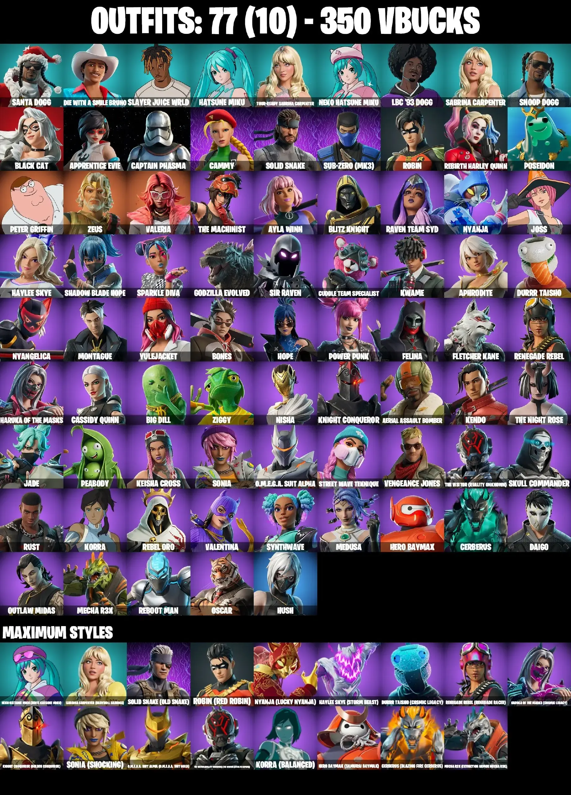 77 SKINS | CAMMY | SUB-ZERO MKE | APPRENTICE EVIE | CAPTAIN PHASMA | SNOOP DOGG | OUTLAW MIDAS | HATSUNE MIKI | HATSUNE MIKU MAX | HAYLEE SKYE MAX | DURRR TAISHO MAX | VALENTINA | CAN PLAY ON PSN,XBOX,PC,NINTENDO,MOBILE | 350 VBUC