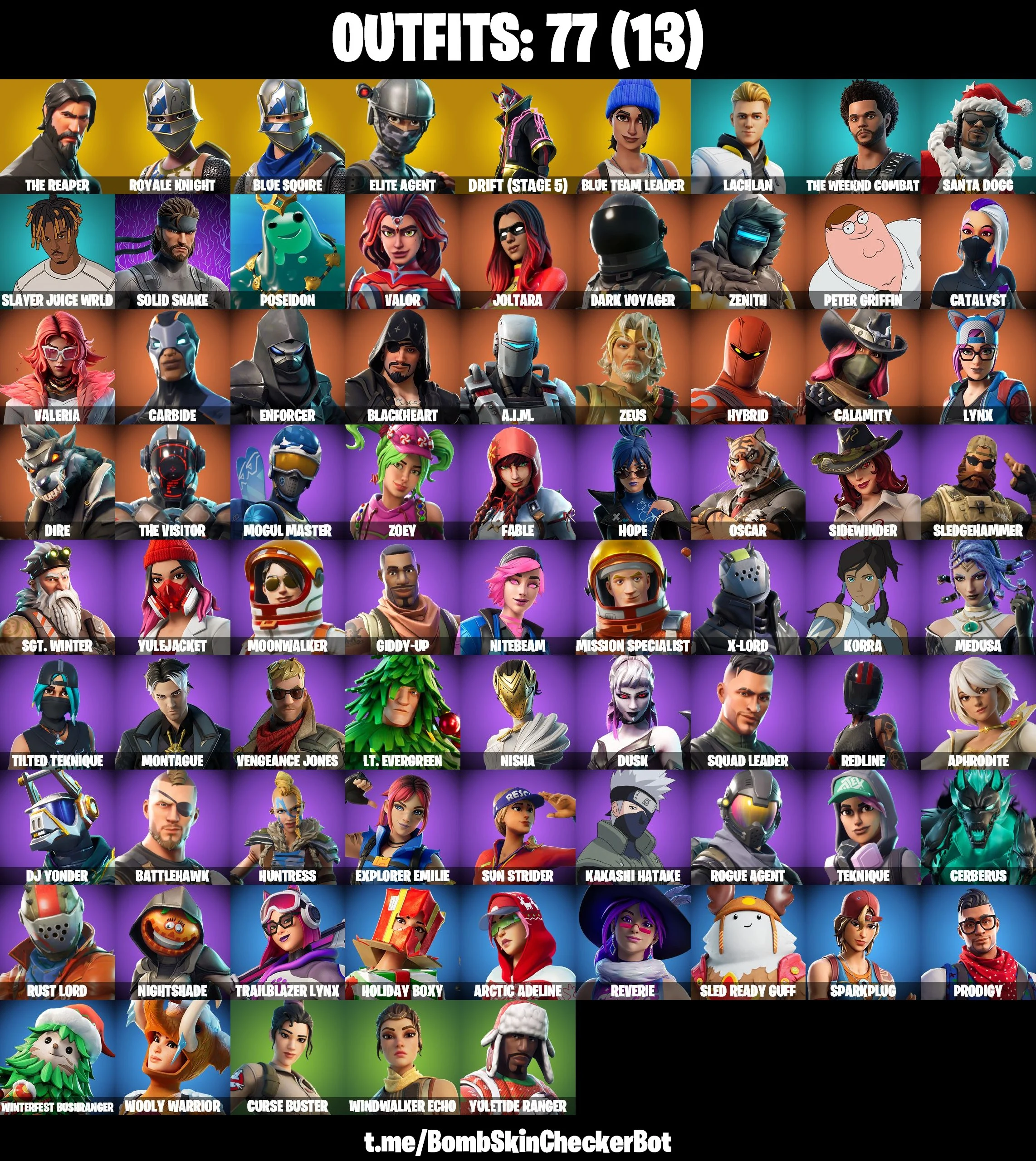 77 Skins| Royale Knight, Blue Squire, The Reaper, Hot Marat, Take The L, The Worm, Rogue Agent, Elite Agent, Blue Team Leader, Kakashi Full Access