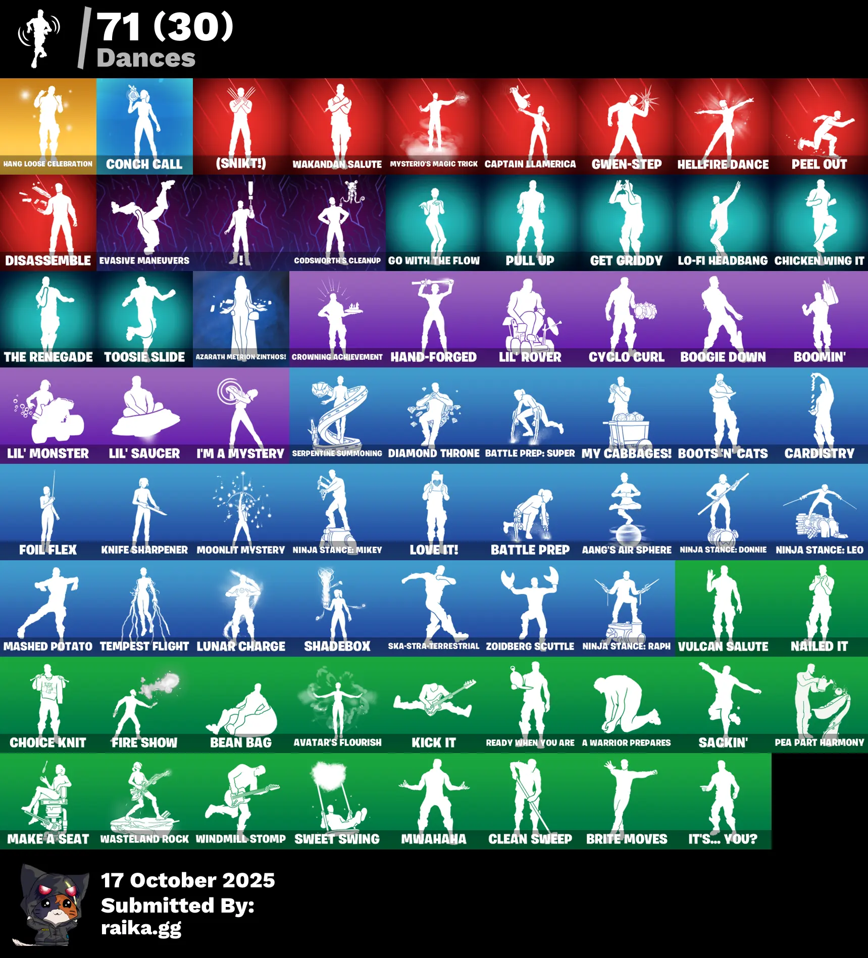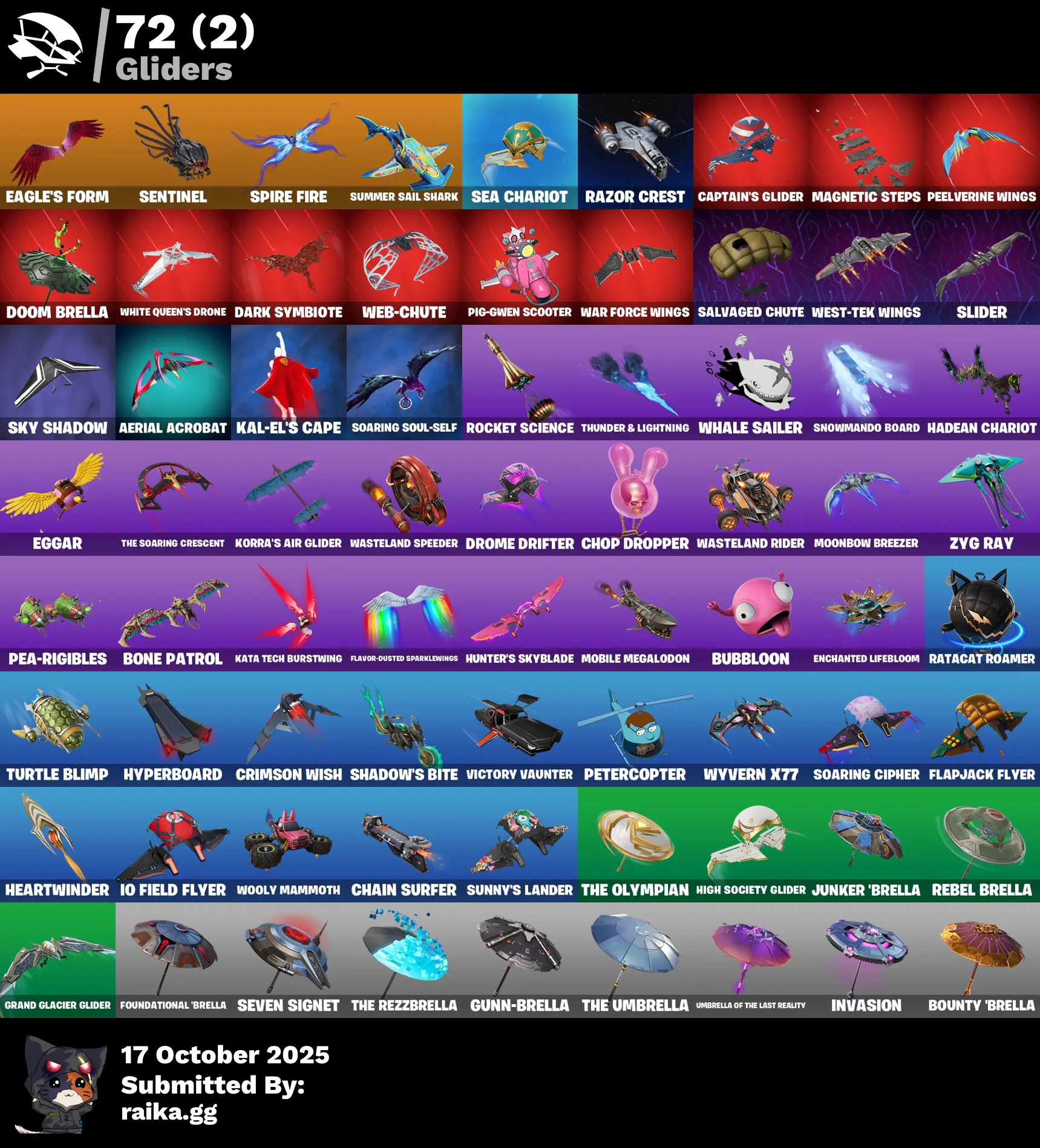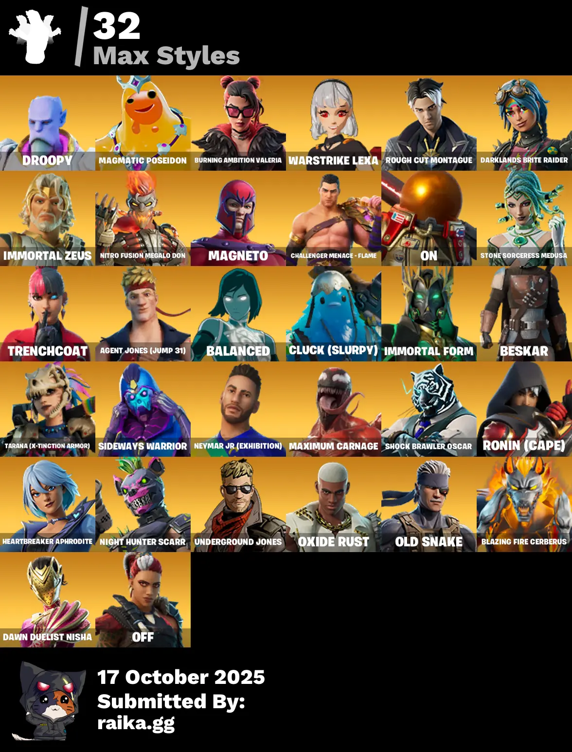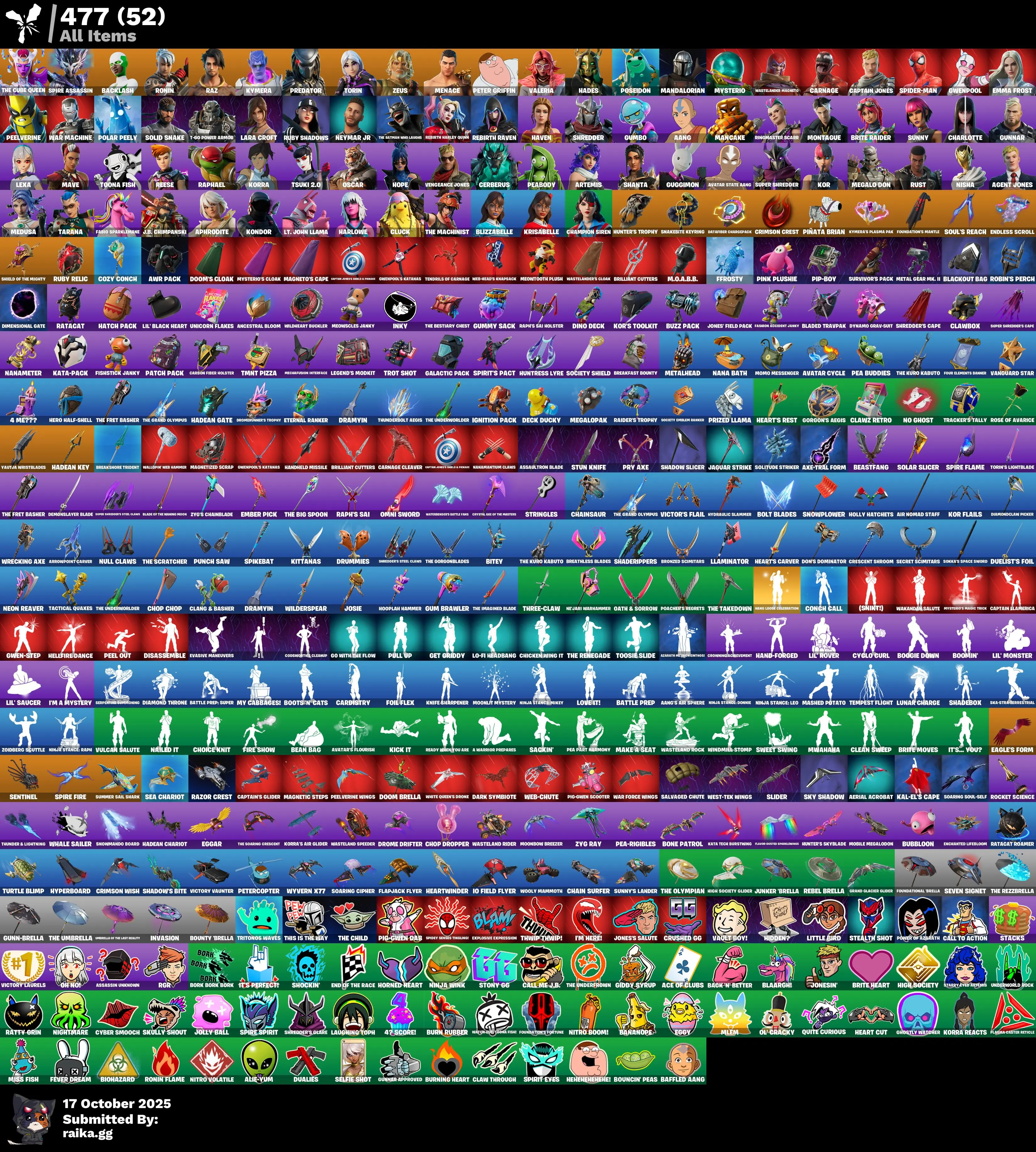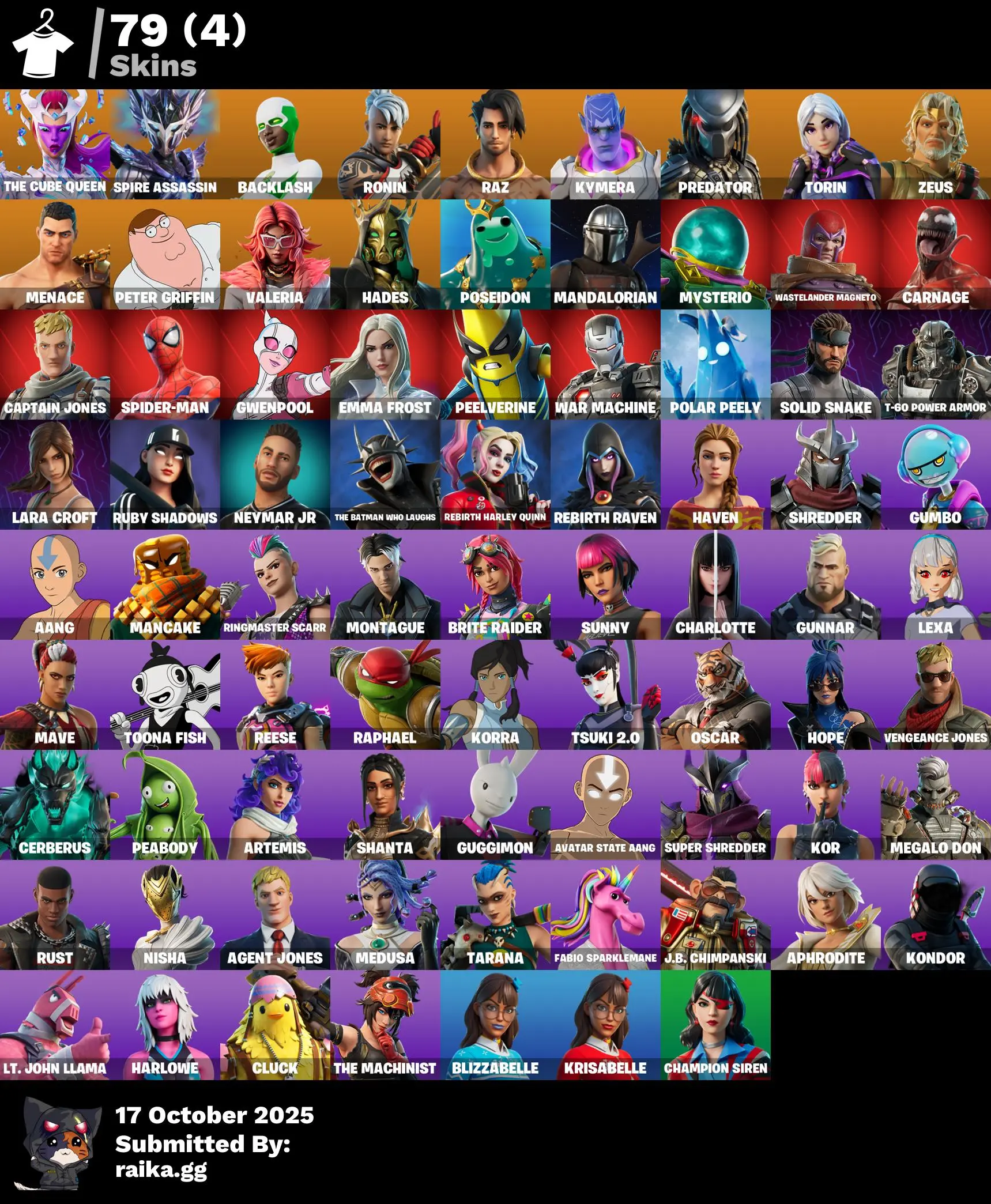 79 skins | Mandalorian🐔Raz🐔Poseidon🐔Kymera🐔Peelverine🐔Menace🐔Hades🐔Wastelander Magneto🐔Backlash🐔Ronin🐔Zeus🐔Emma Frost🐔Carnage🐔Valeria🐔Gwenpool🐔Mysterio🐔Captain Jones🐔Peter Griffin🐔Spire Assassin🐔Spider-Man🐔Predator🐔Torin D5130