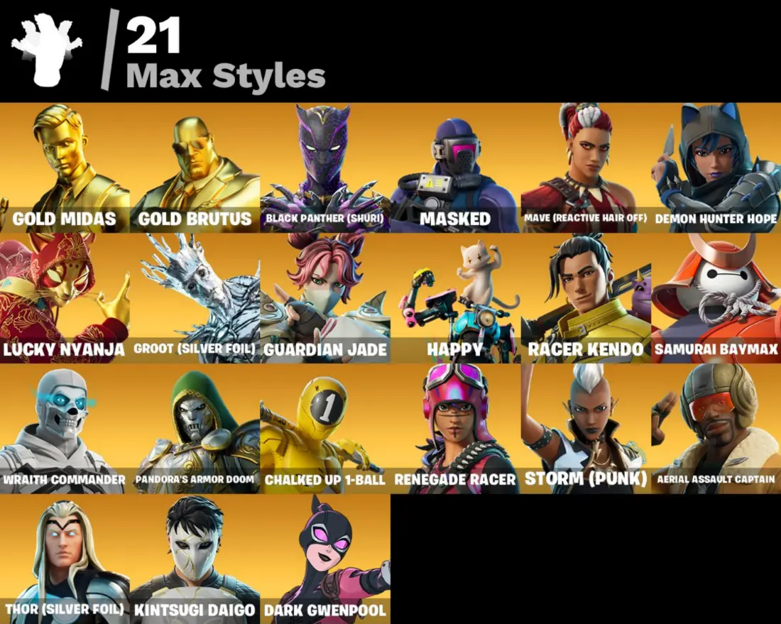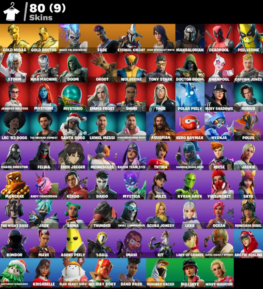 80 skins | Gold Midas | Gold Brutus | Renzo the Destroyer | Fade | Eternal Knight | Gear Specialist Maya | Mandalorian | Deadpool |