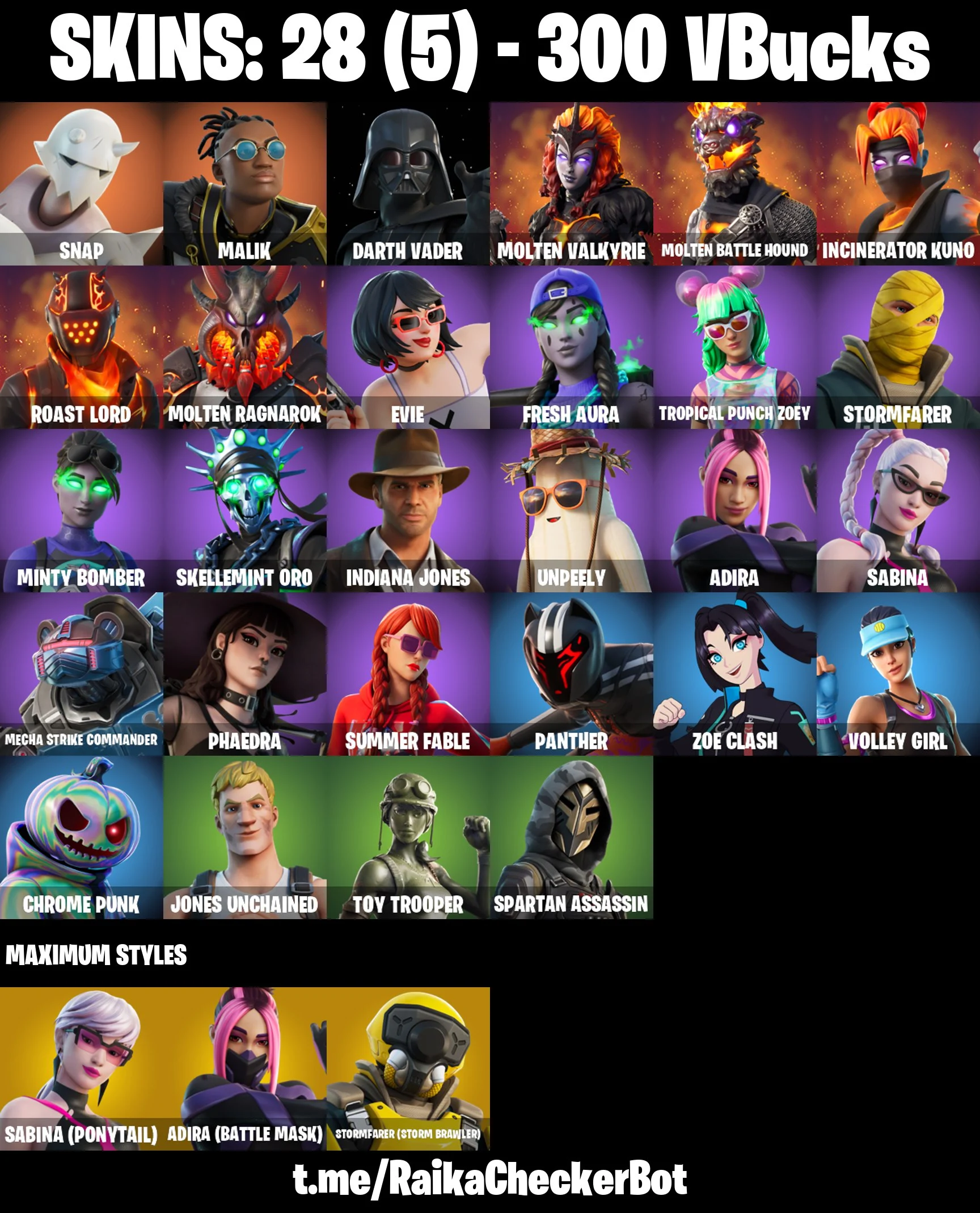 ๐๐ฅ EXCLUSIVE DEAL ๐ฅ๐ 28 SKINS ๐ MALIK ๐ SNAP ๐ DARTH VADER ๐ ROAST LORD ๐ MOLTEN BATTLE HOUND ๐ INCINERATOR KUNO ๐ MOLTEN VALKYRIE ๐ MOLTEN RAGNAROK ๐ 300 VBUCKS โก๏ธPC/PSN/XBOXโก๏ธ