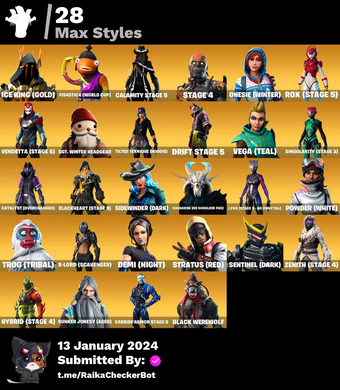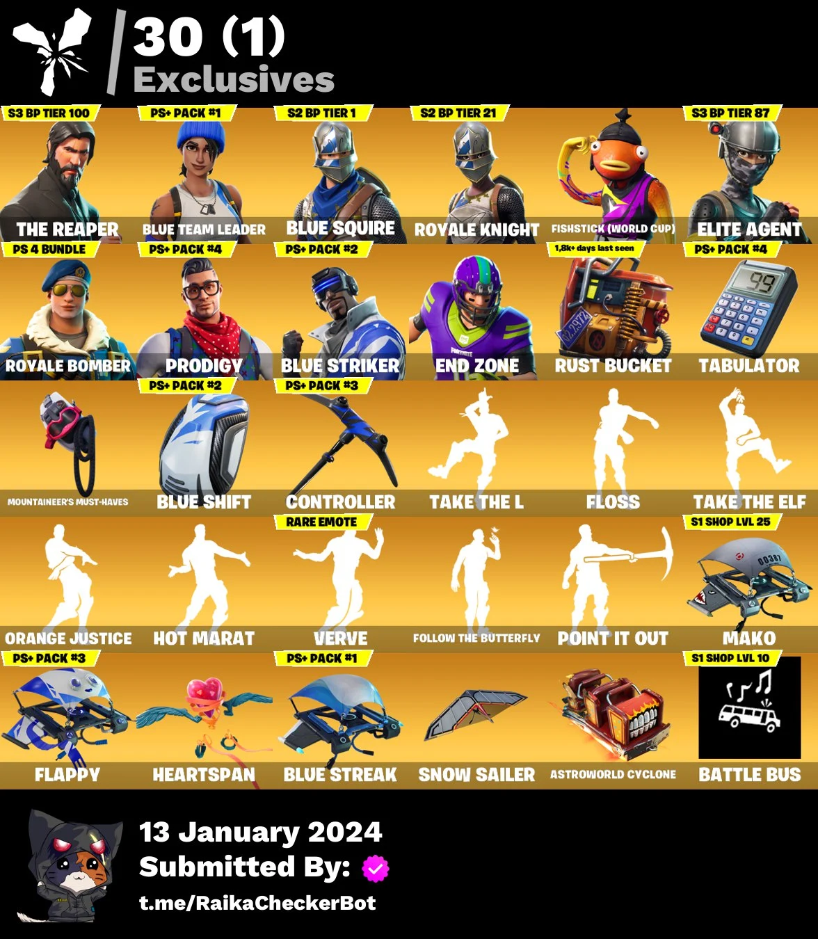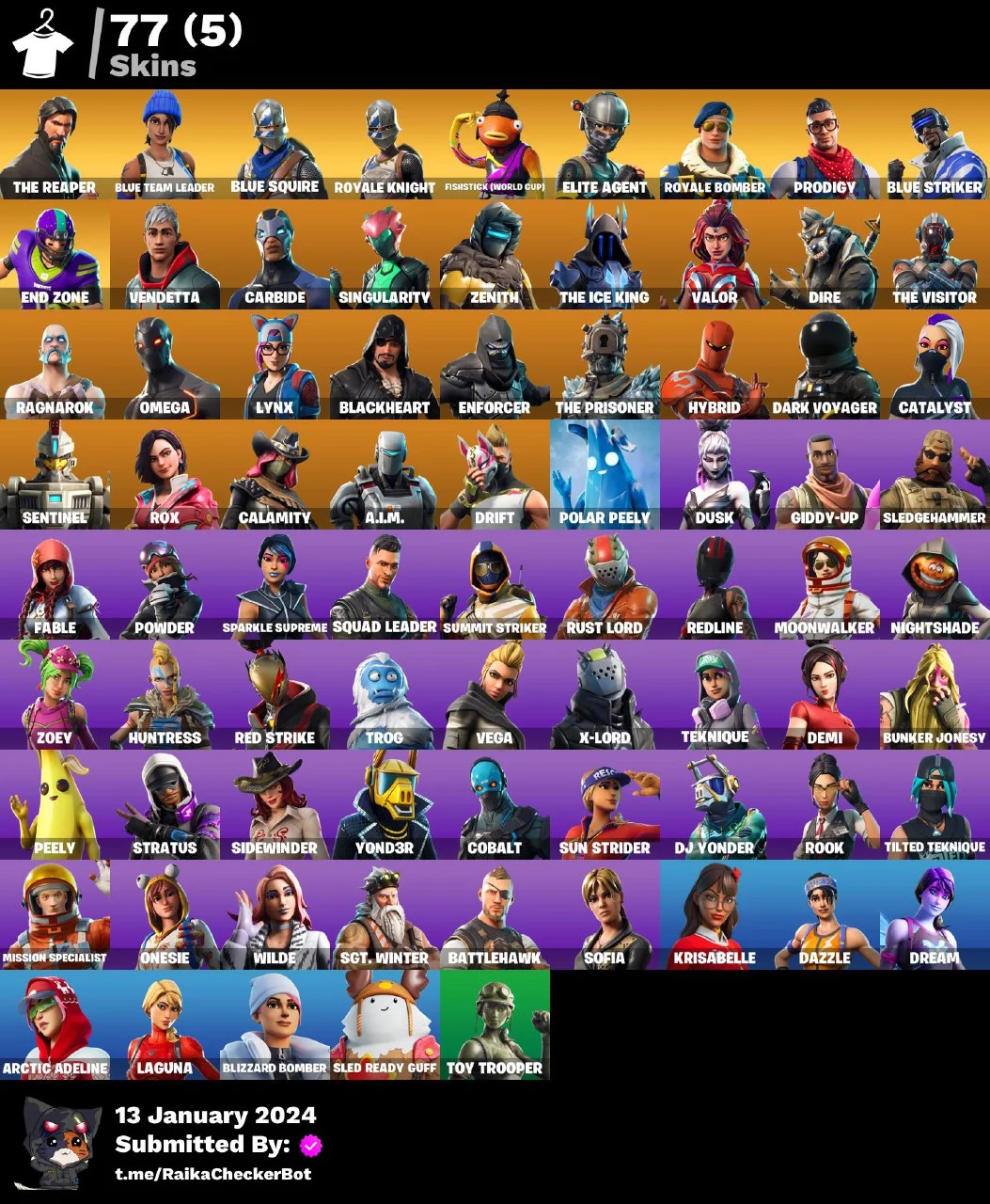 â Inactive for 4 years | 77 skins | Floss | take the L | The Reaper | Blue Team Leader | Blue Squire | Royale Knight | Fishstick (World Cup) | Elite Agent | Royale Bomber | Prodigy | 200 V