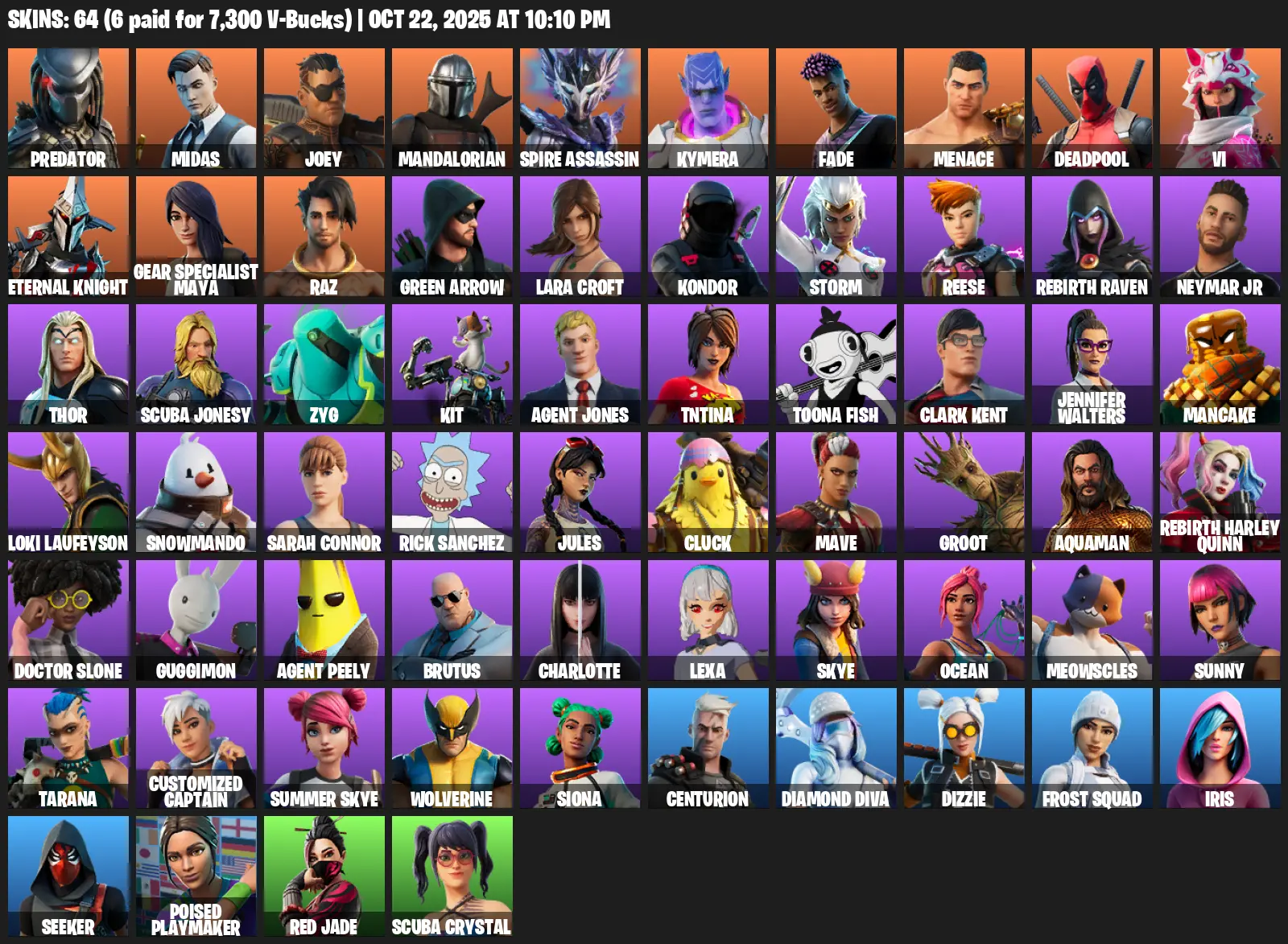 [PC] | 64 skins | Leviathan Axe | Lara Croft | Predator | Midas | Joey | Mandalorian | Spire Assassin | Kymera | Fade | Menace | #KFA3786 | #MBFN